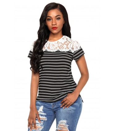 Black short-sleeved lace-ornamented stripe shirt [LAST CHANCE]