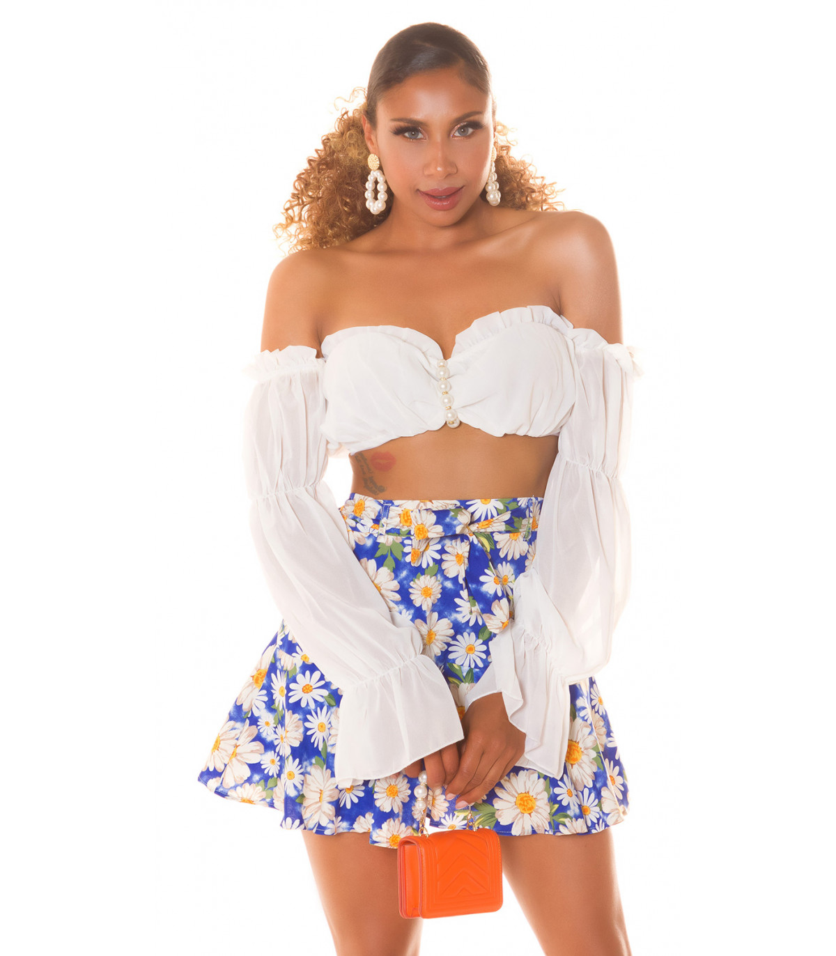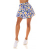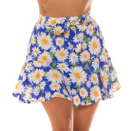 Blue high-waisted sunflower print shorts skirt with belt. The skirt is best suited for those with a narrow waist relative to the hips. hip circumference corresponds to normal sizing, waist circumference is smaller.