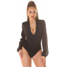 Black long-sleeved wrap-look with v-body mesh sleeves. A feminine bodysuit with a v-neckline is fabulous with both trousers and skirts. The wrap-around cut emphasizes feminine forms. Long mesh sleeves add showiness to the bodysuit and make the long-sleeved bodysuit lighter to wear. The black bodysuit is easy to combine with lower parts of different colors. If the deep ribbed v-neck feels too spacious for your style, you can put a platform top underneath the bodysuit. A bold bodysuit looks most amazing with breast tapes, as breast tapes ensure that the bra is not visible from the neckline, but provide support for the breasts. For small breasts, this open bodysuit is stylish, and small breasts may not even need breast tape. If you want to make sure the fabric stays in place, consider wearing clothing tape at least for special occasions. Body is suitable for dates, get-togethers and many parties.