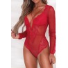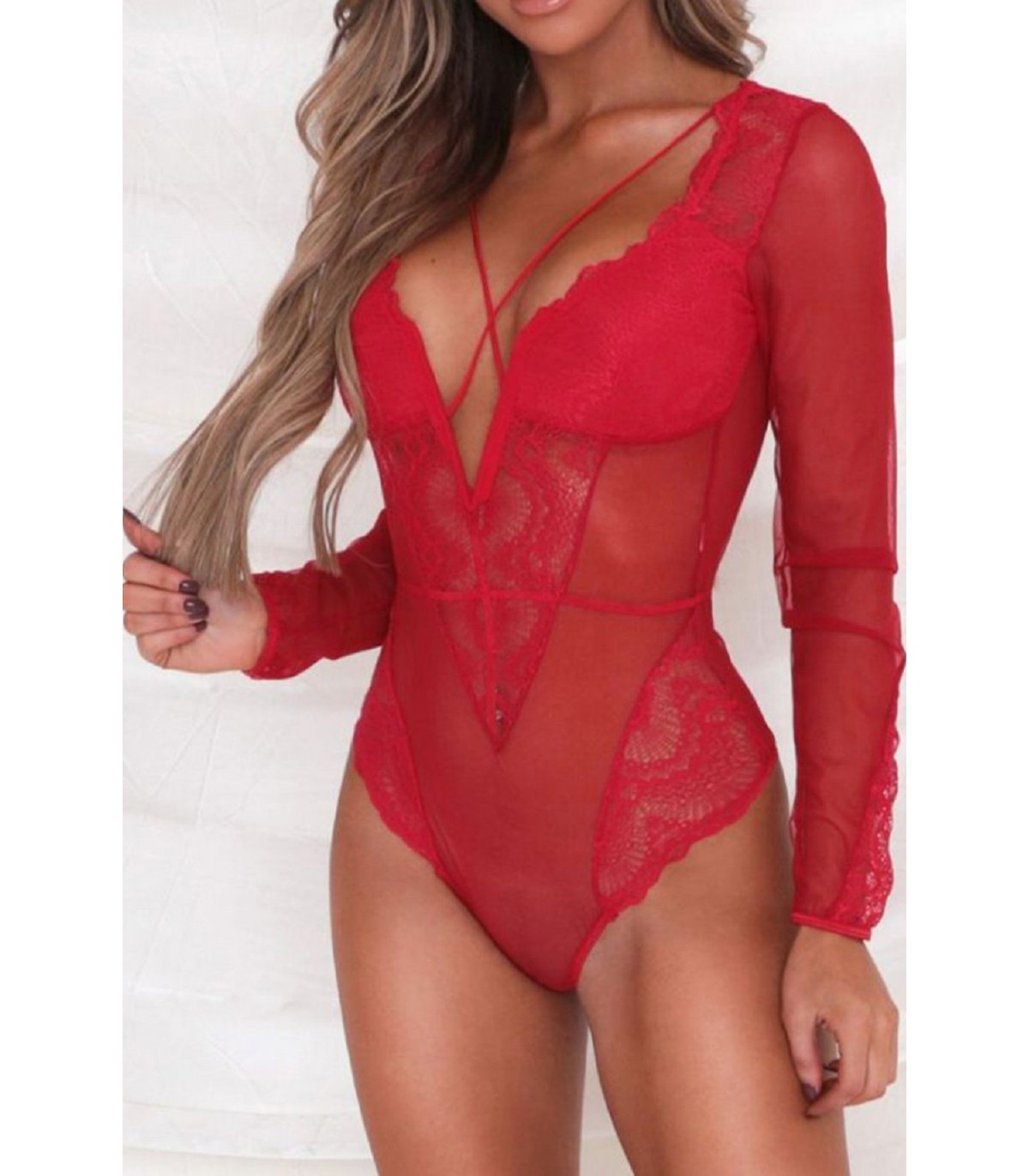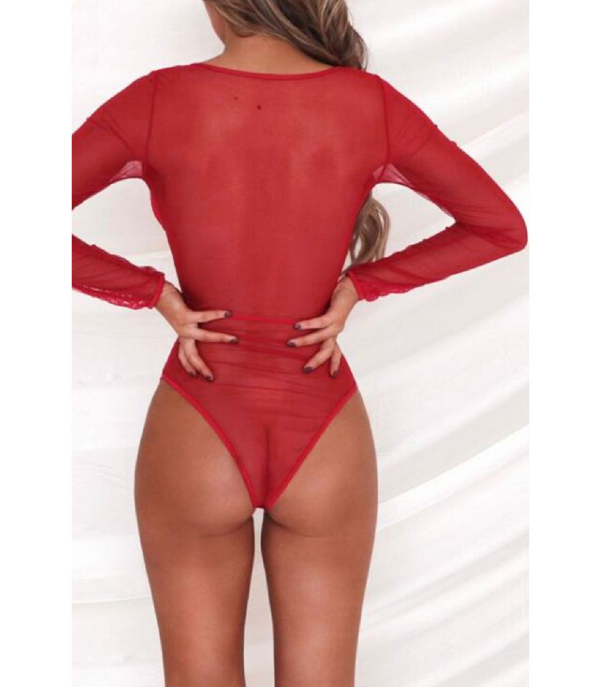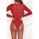 Red long-sleeved mesh and lace-ed bodysuit with thighs. Best suited for women who are about 165 centimeters tall. If you're thinking between two sizes, take a smaller one.