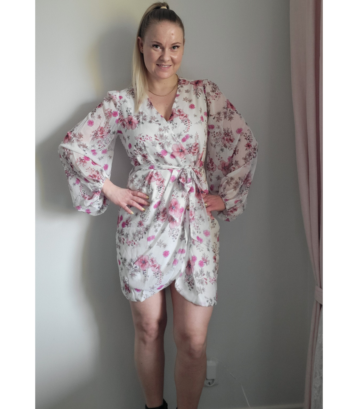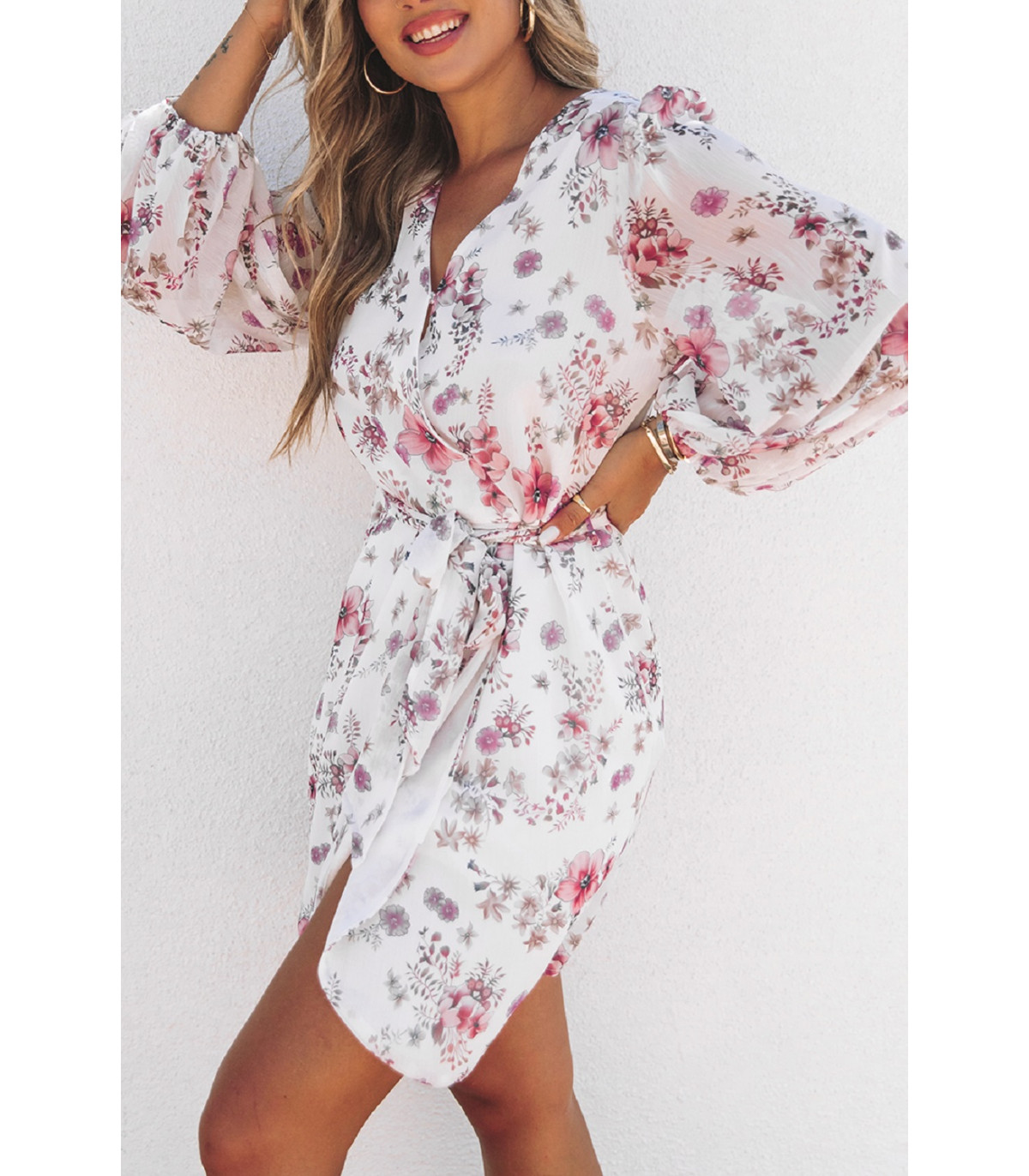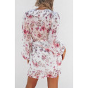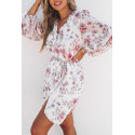 White floral pattern wrap-look v-chiffon dress with belt