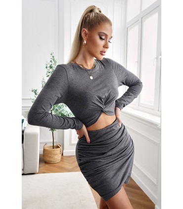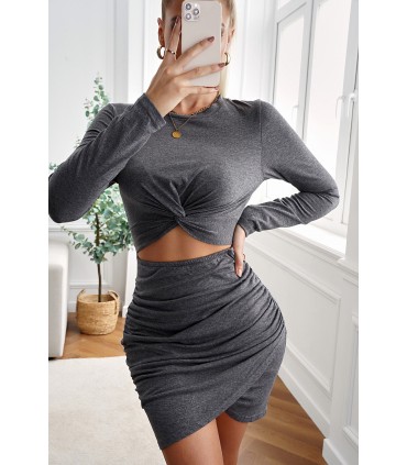 Dark grey long-sleeved knot-tinted wrap-look dress with slit