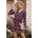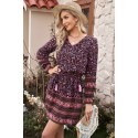 Purple long-sleeved floral pattern boho dress. A boho style long-sleeved dress is a feminine casual dress or a casual date dress. The ribbing at the waist accentuates the waist, bringing out body shapes. If you want to emphasize your feminine forms more, try on a dress with a waist belt as well. The casual floral pattern dress is suitable for year-round wear with thick tights and leggings.