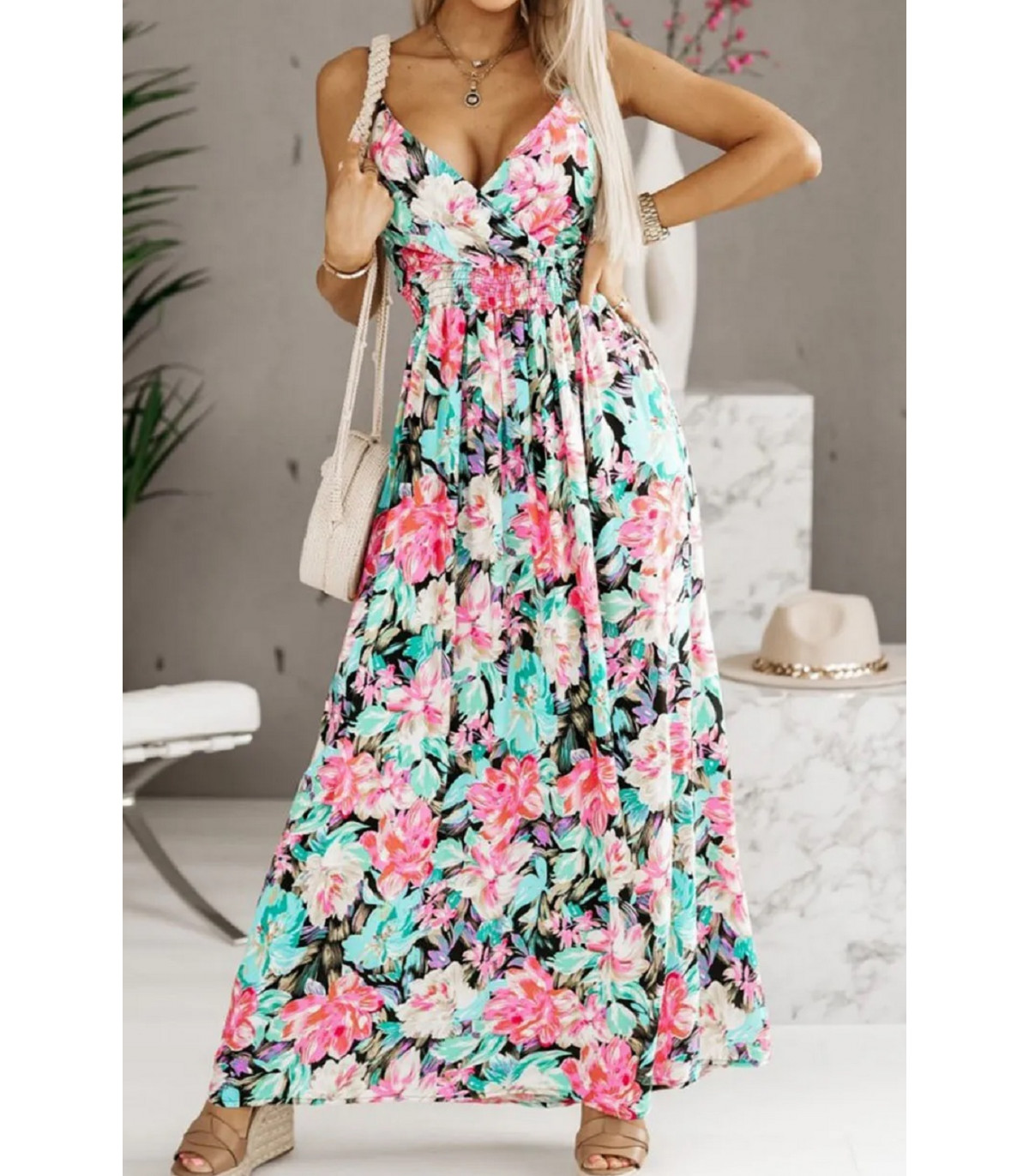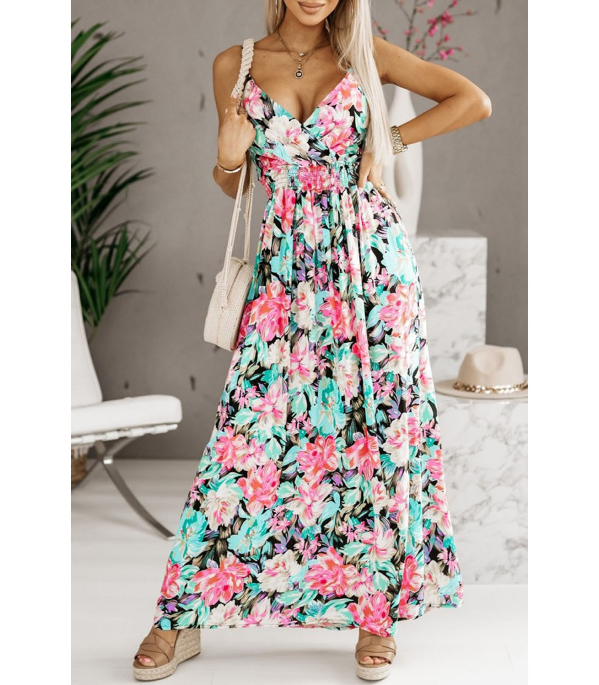Colorful floral pattern wrap look v-maxi dress. Elastic ribbing at the waist. Try the dress with a waist belt too! The dress is best suited for people under 165 centimeters.
