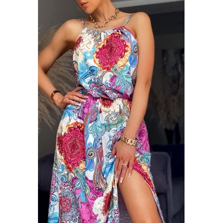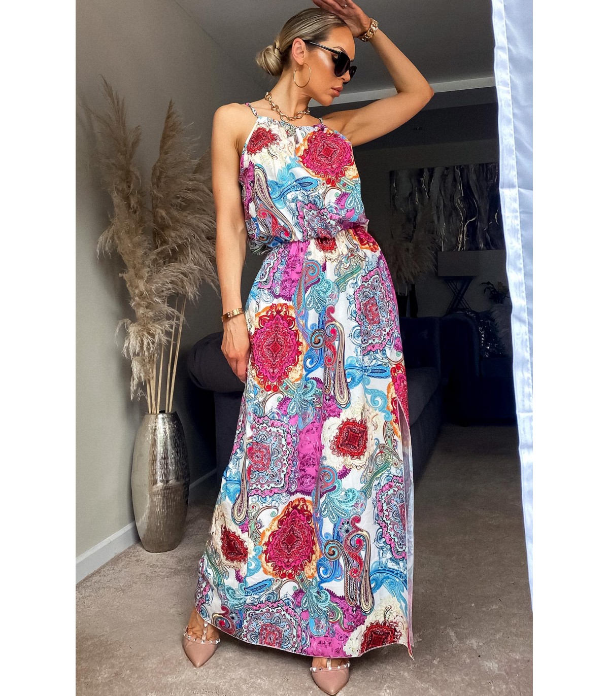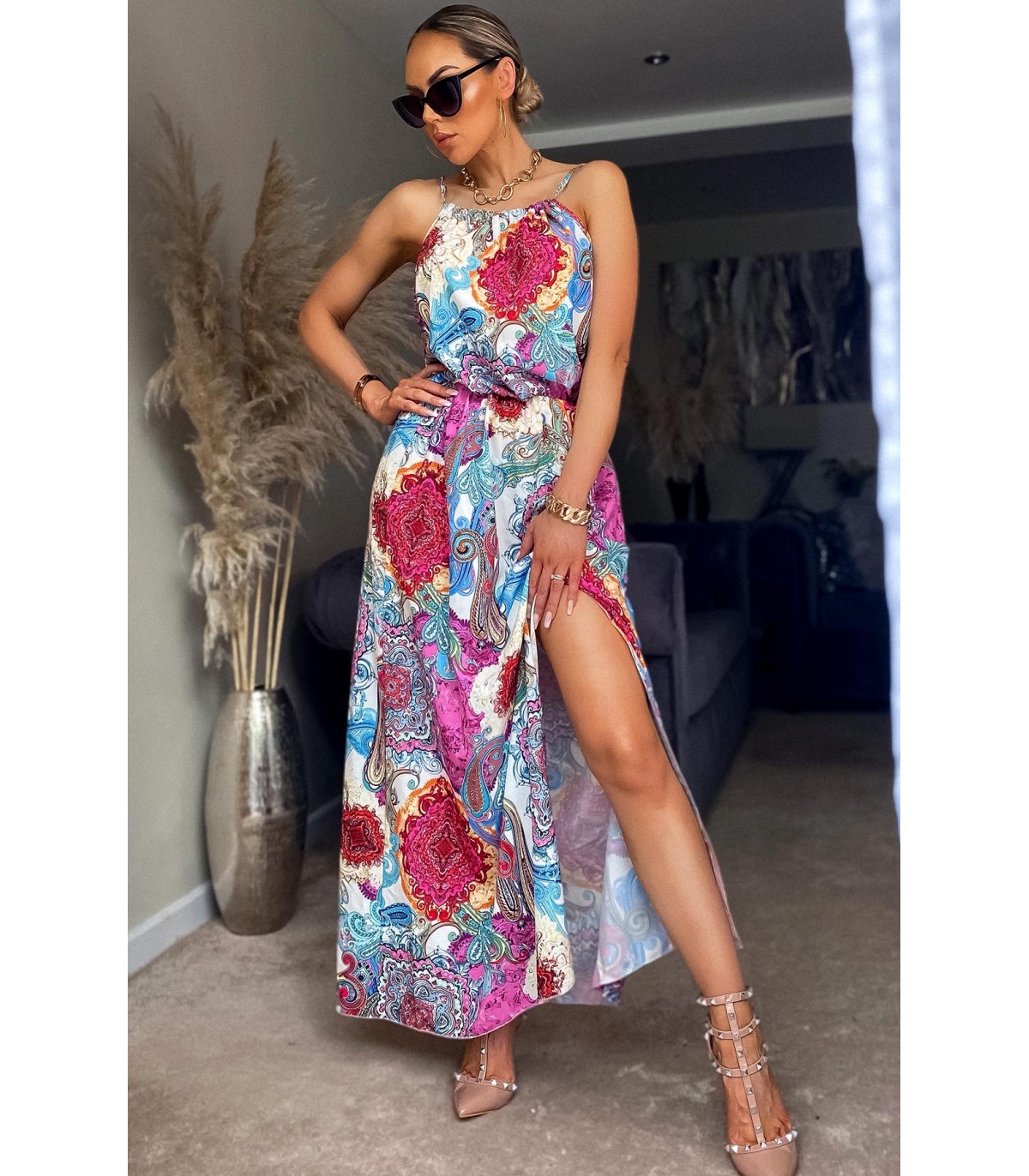 Print Pattern maxi dress with a baggy top and slit. Try on the dress with the waist belt too! Made in Europe.
