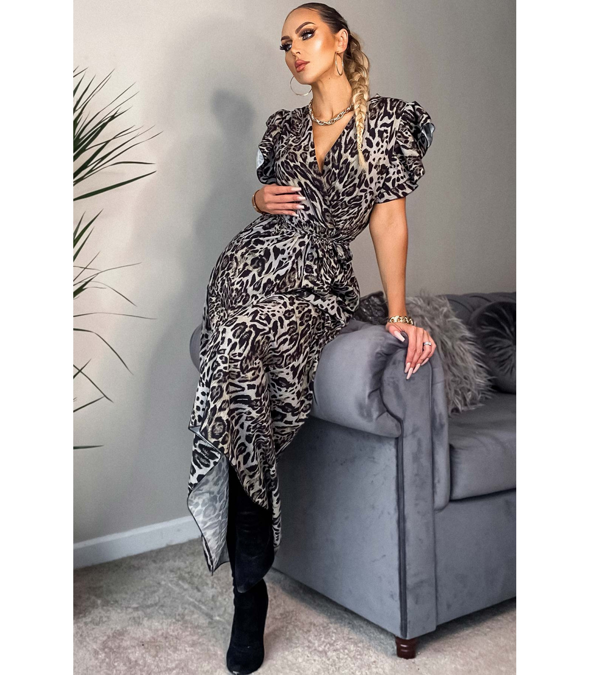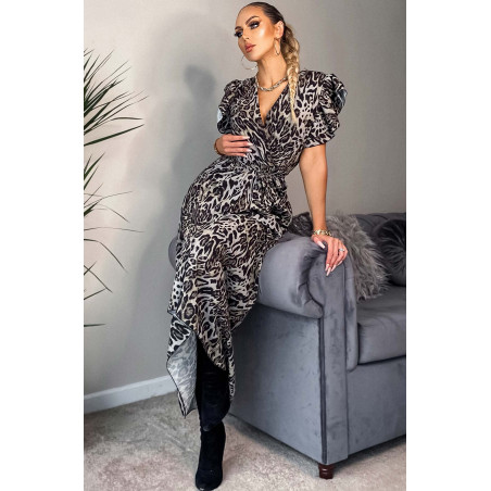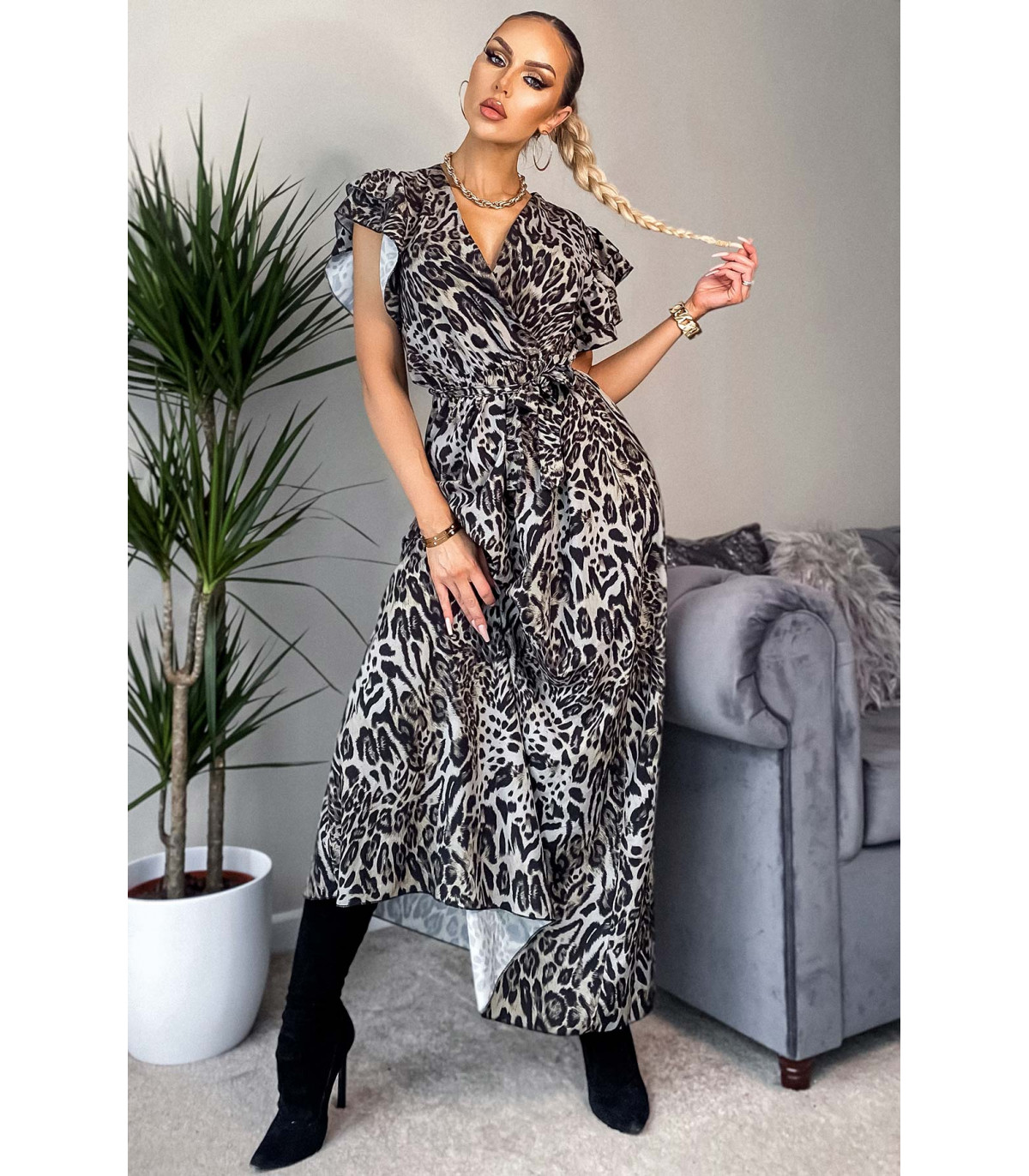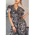 CW Cordelia olive leo pattern with v-maxi dress ruffles