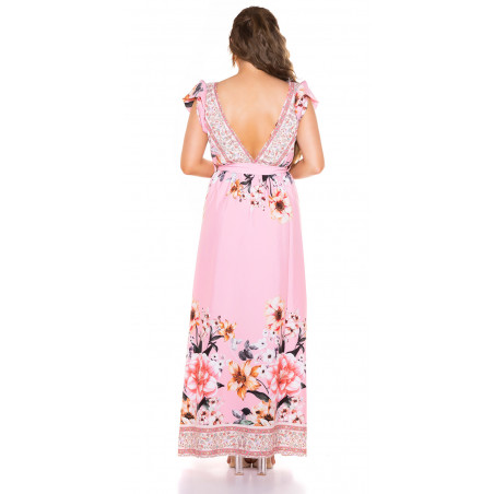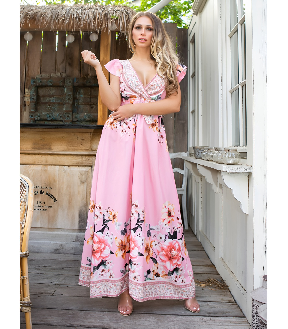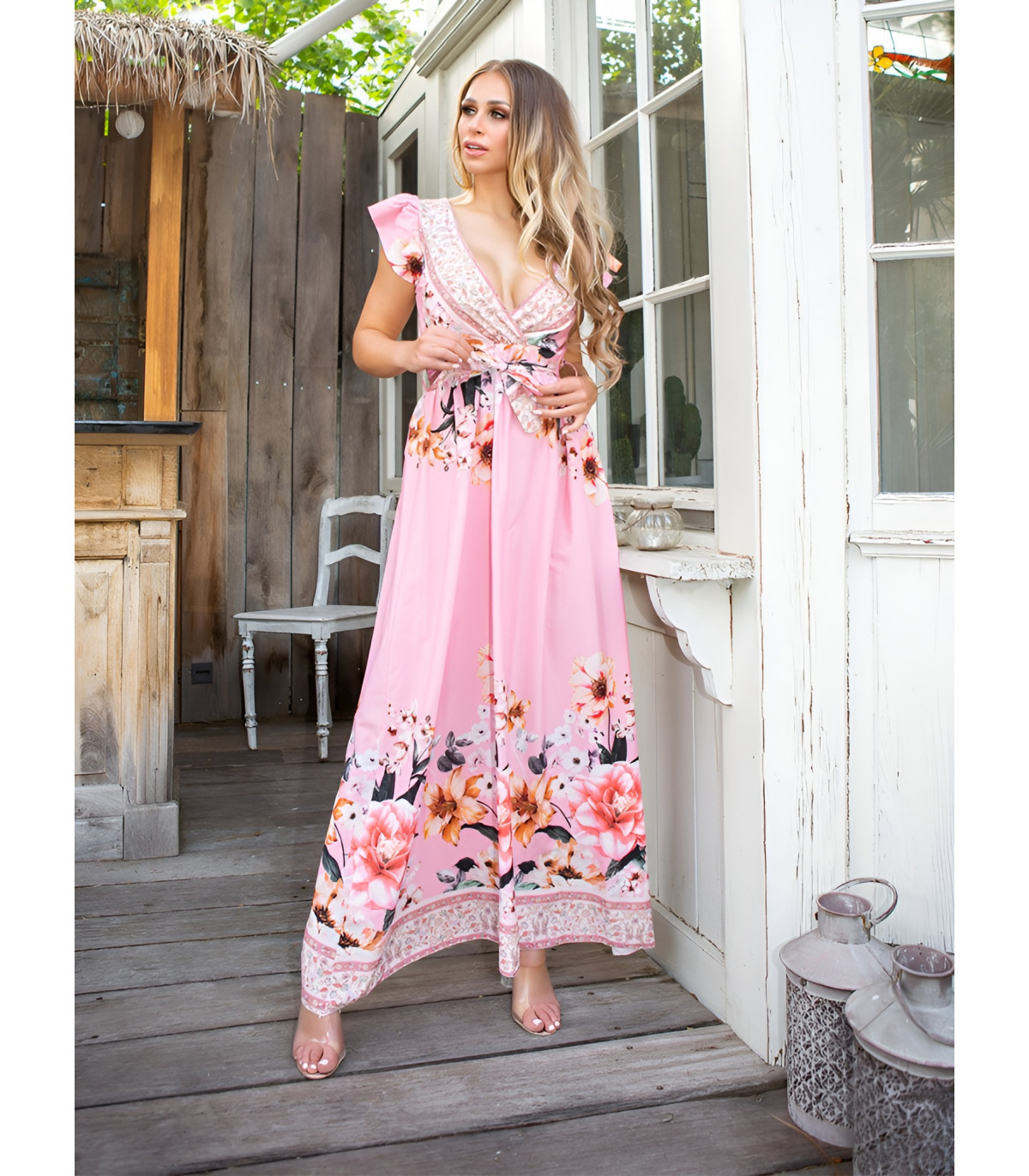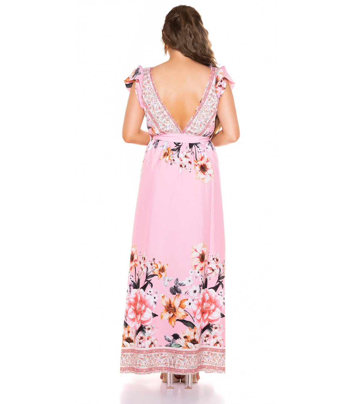 Pink floral pattern with v-maxi dress ruffles and belt. Best suited for approx. 165 cm.