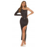 Black single-sleeved long glitter dress with a spectacular chain-trimmed back, chain strap and slit. Fabulous glitter dress with spectacular details will catch the eye. A dress that glitters in the lights is inexpensive, but fabulous gala dress. A chain-trimmed, single-sleeved glitter dress with a slit is suitable for various celebrations, as well as for occasions that require fabulous, festive dress. A single-sleeved, open-backed party dress with chain decoration stands out from the crowd. Sparkling glitters add their own touch to the dress. The black glitter dress is elegantly sexy. Under an open-back dress, you can get breast support with lapel tape or a discreet bra. High heels and a small bag will complete the festive style.