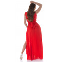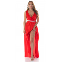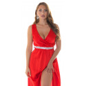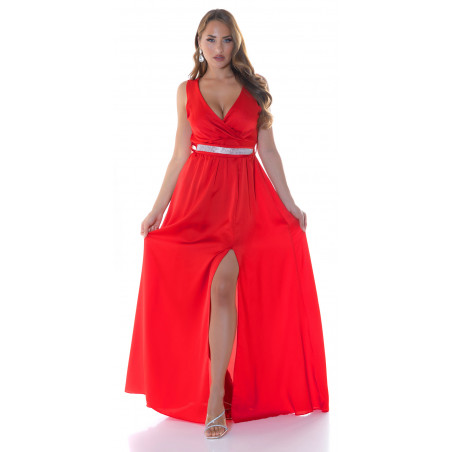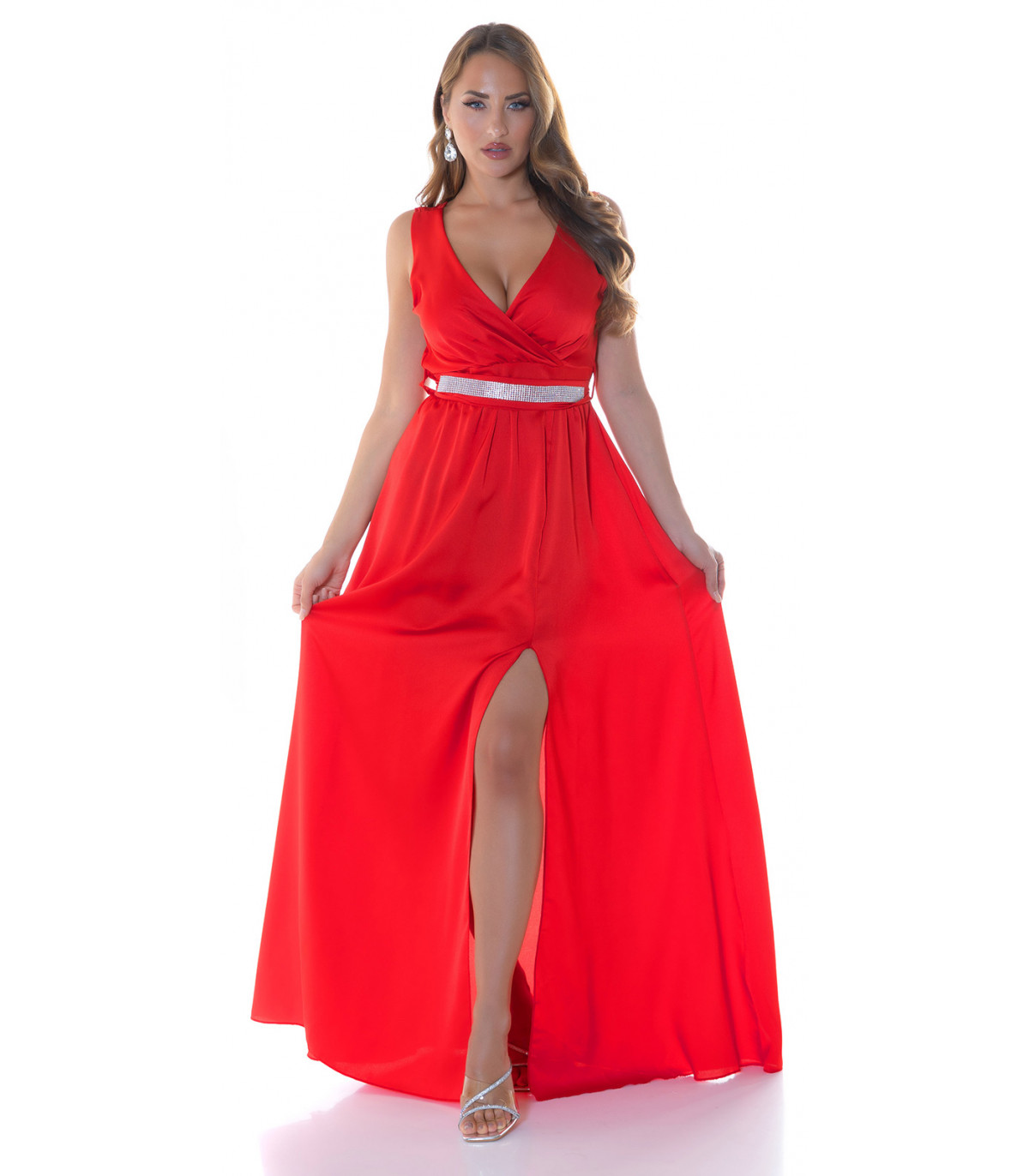 Red long satin look v-dress with slit and belt embellished with rhinestones.