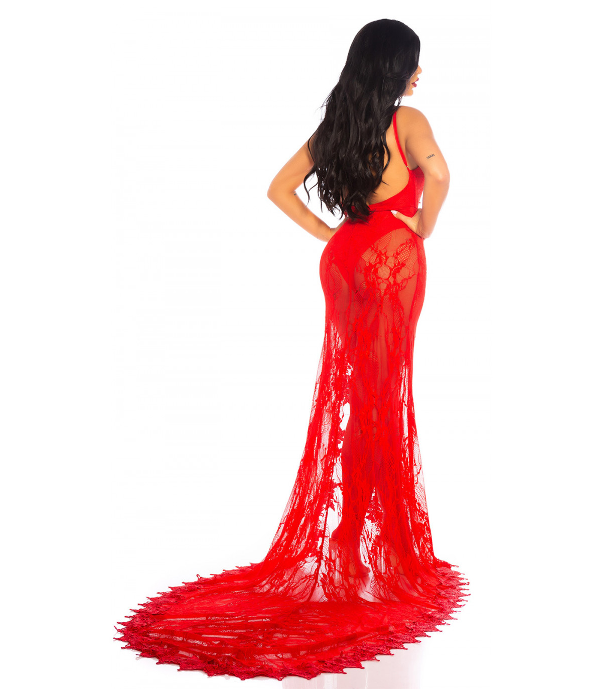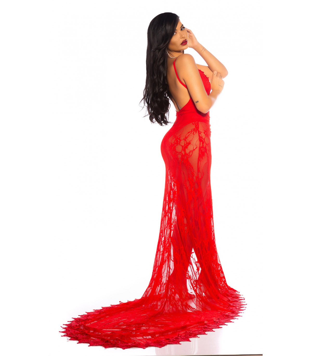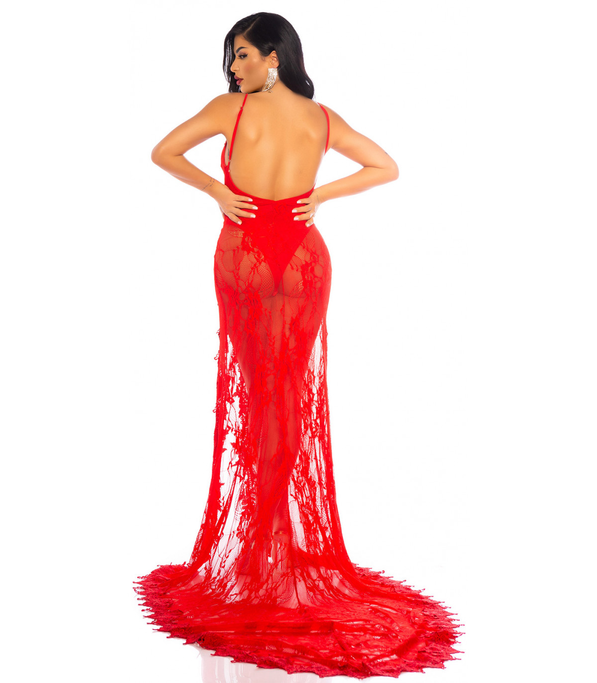 Red long lacy v-body dress