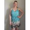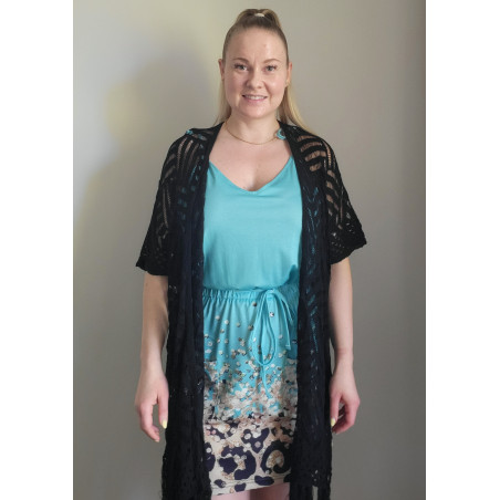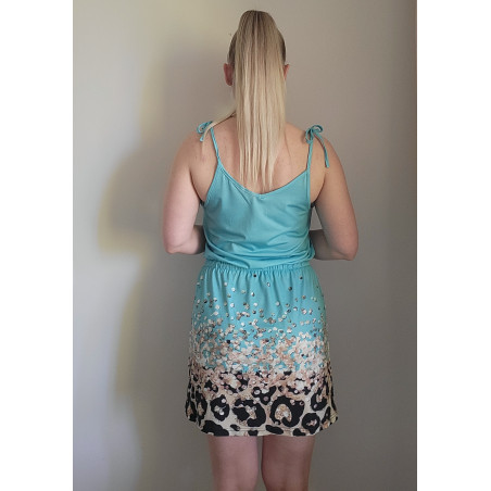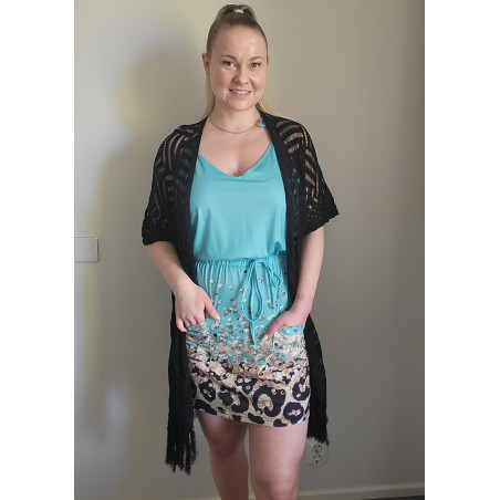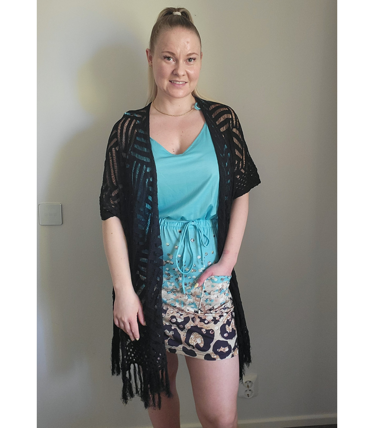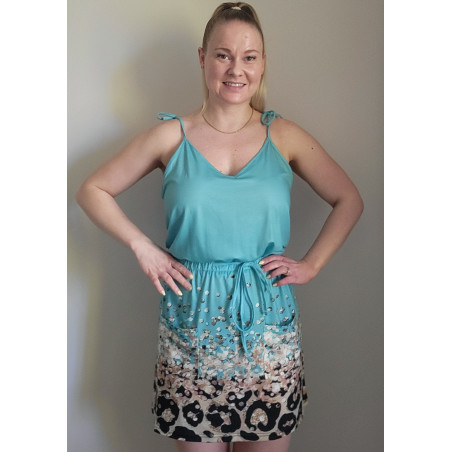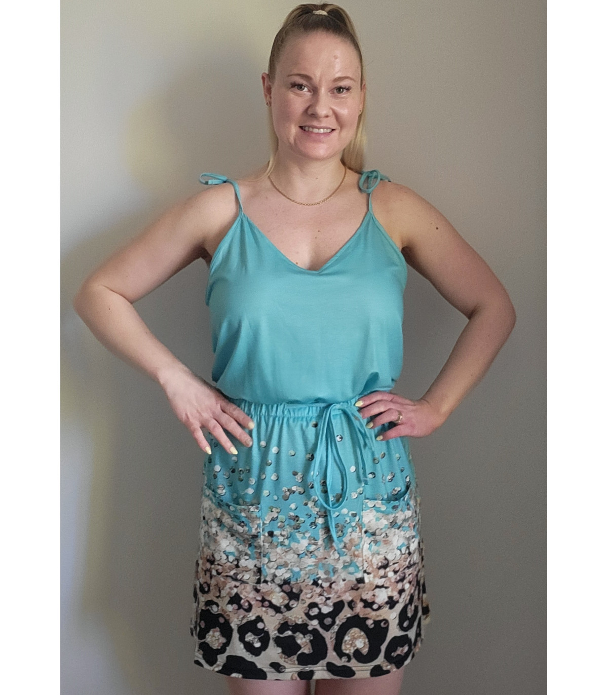 Oli just kuvan värinen mekko ja sileetä kangasta ja edessä pienet taskut ihan kivan rento mekko