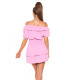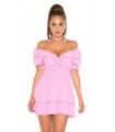 Pink short-sleeved wrap-look v-dress with ruffles and waist wrinkles. The short model is best suited for 165 centimeters or less.