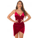 Burgundy two-shouldered velvet look wrap-look v-mini dress with asymmetrical hem.