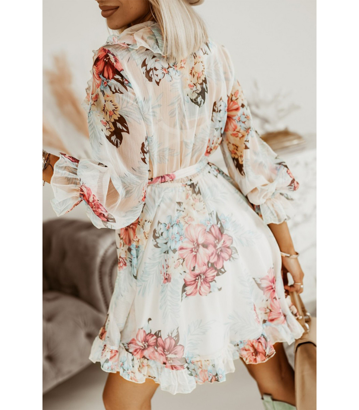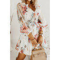 White floral pattern v-ruffle dress with belt