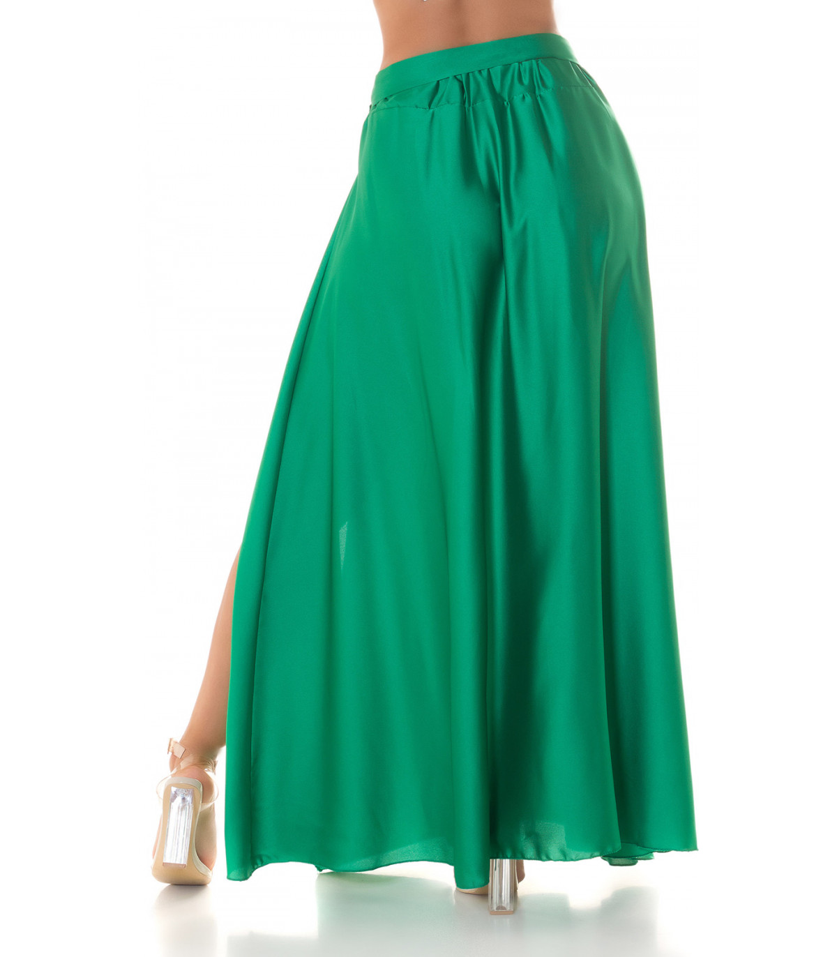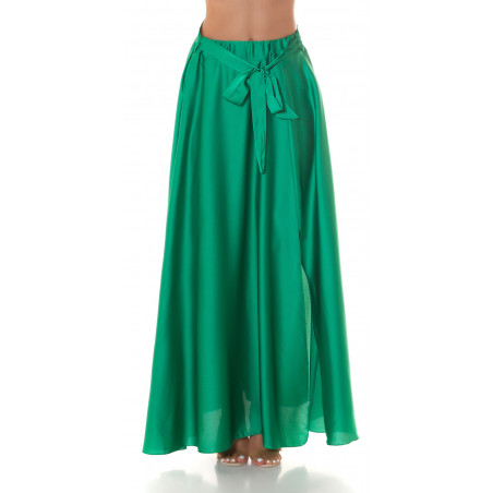 The green high-waisted satin look maxi skirt with a slit and belt.