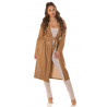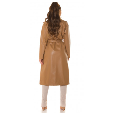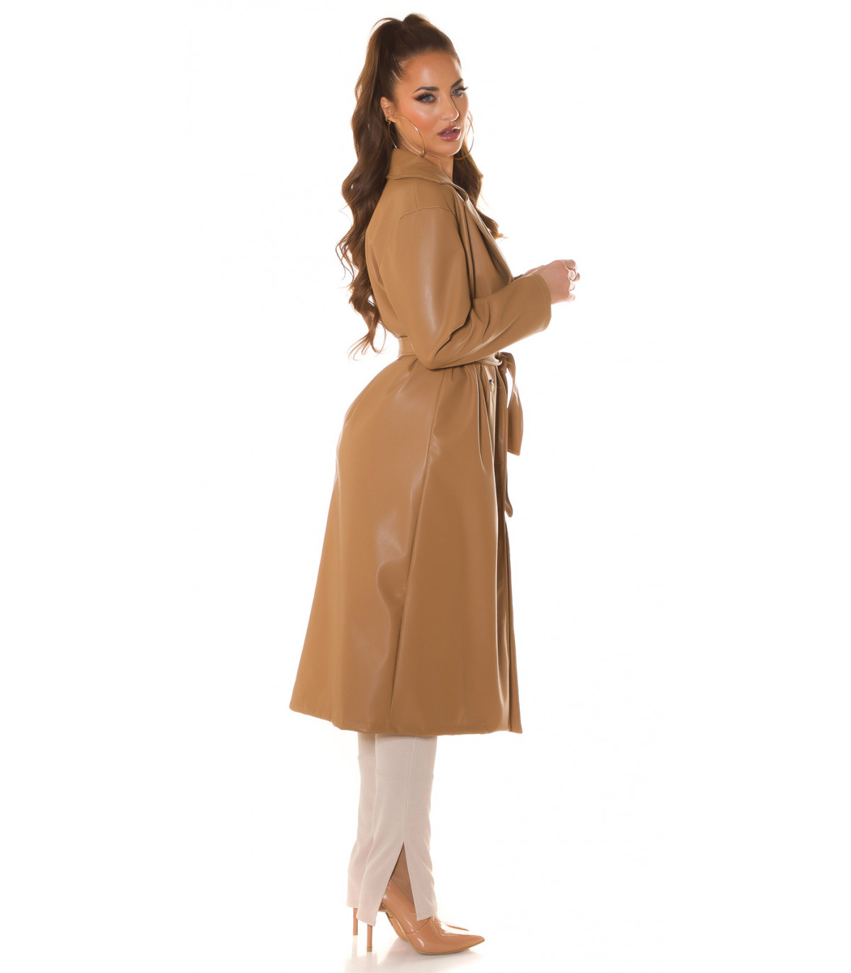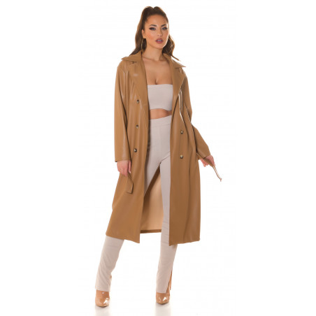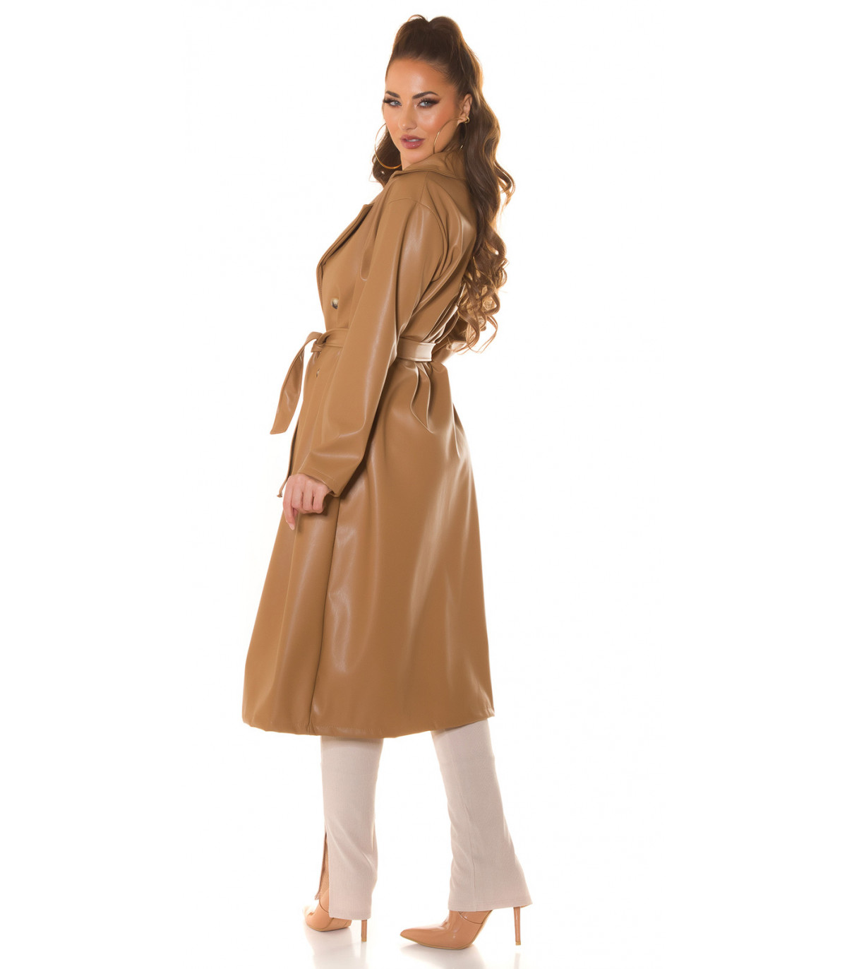 Cappuccino faux leather trench coat with buttons and belt. The women's long trench coat is fabulous a spring coat, a summer coat and an autumn coat - suitable for temperatures of about 10C+. In cooler weather, you can put a sweater under the trench coat, in warmer weather, for example, just a mini dress is enough. A button-down leatherette trench coat with a belt looks stylish both with trousers and with dresses or skirts. A women's trench coat is a fashionable jacket from year to year, and the faux leather material makes the jacket look spectacular. A long faux leather jacket with stunning details will delight.