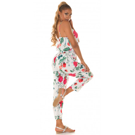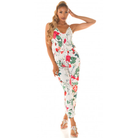 White two-shoulder floral pattern jumpsuit with lacing. Best suited for max 165 cm.