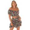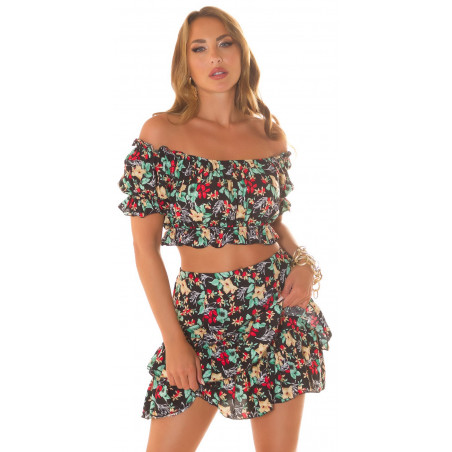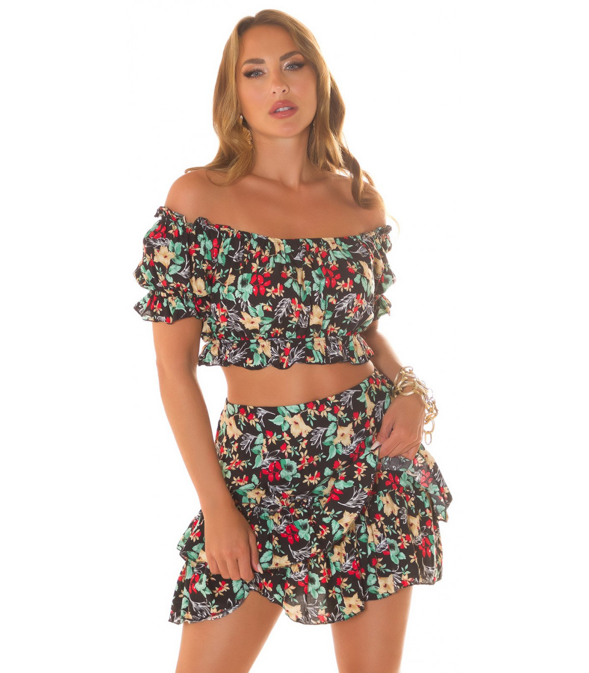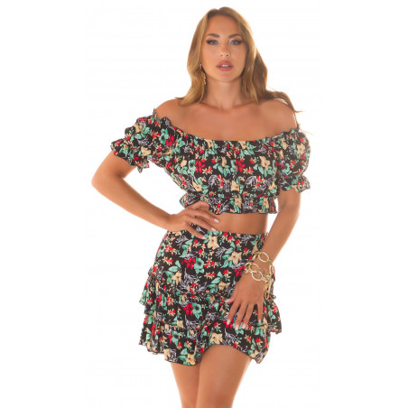 Black short-sleeved shoulder-revealing floral and leaf-patterned short shirt and matching high-waisted ruffled skirt. Use together or separately! The model is best suited for people with narrow waists, relative to the hips.
