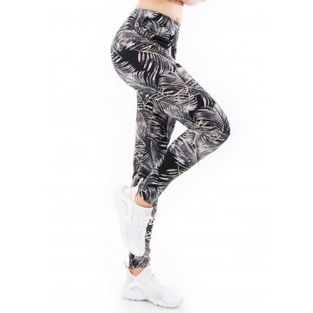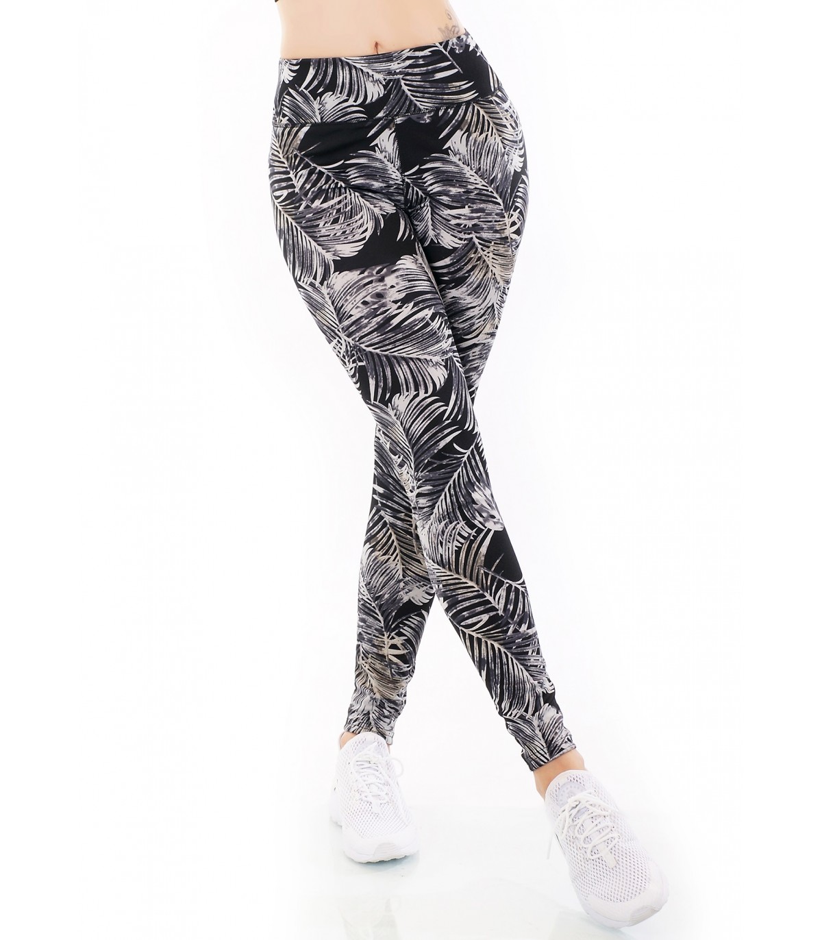 Black and white leaf-patterned workout tights. Best suited for approx. 165-centimeter and hip-waisted people. hip circumference corresponds to the normal size, waist circumference is slightly smaller sizing.