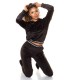 The black outfit set includes a short hooded shirt and matching high-waisted joggers with announcement texts. Joggers are best suited for people about 165 centimeters tall and narrow-waisted in relation to the pelvis.