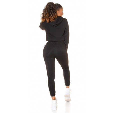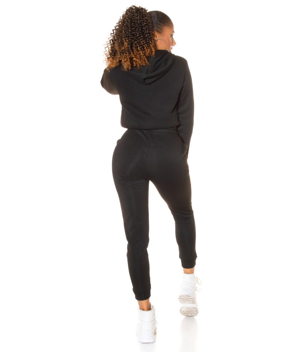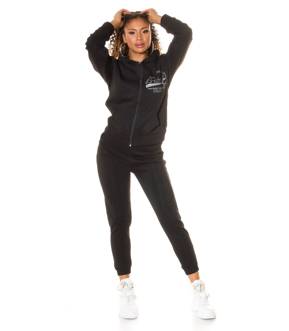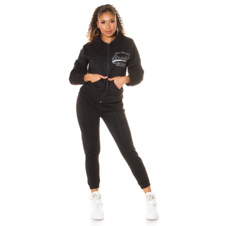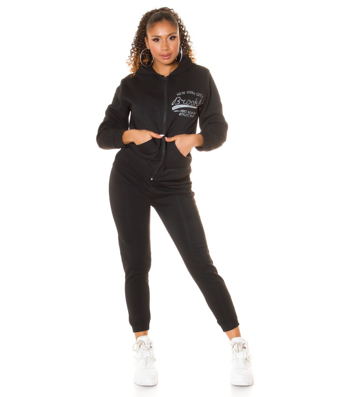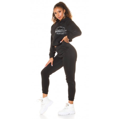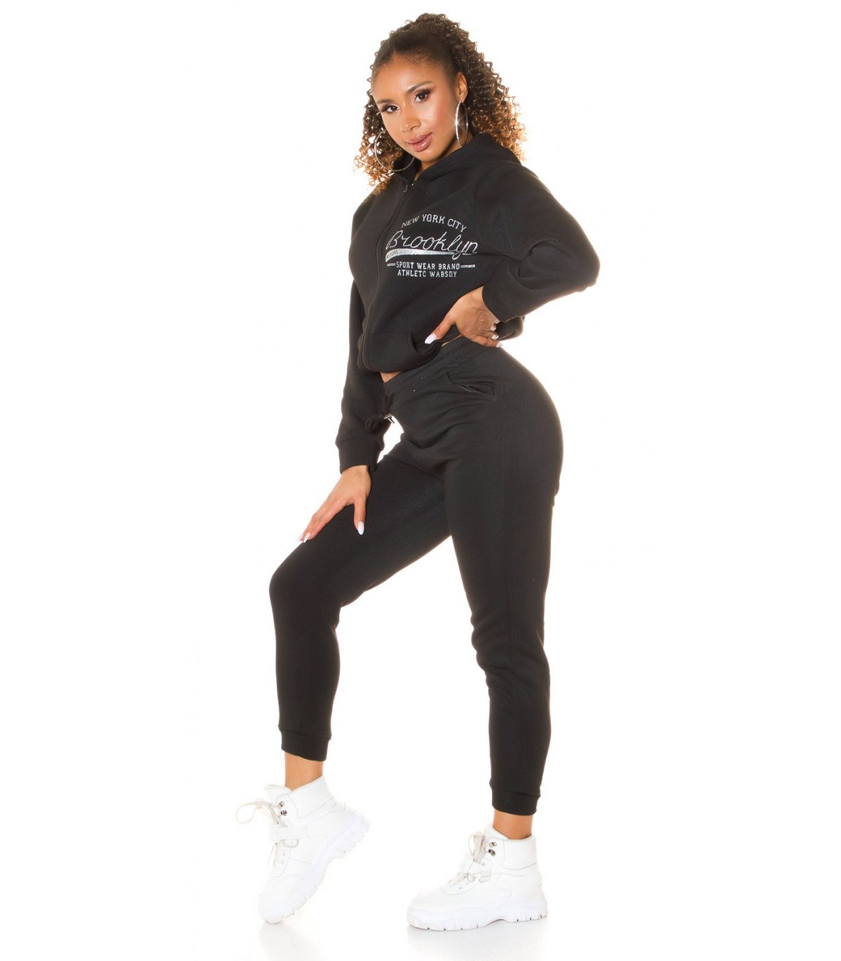 Black front-opening zipped casual Brooklyn hoodie and matching high-waisted joggers. Joggers are best suited for people about 165 centimeters tall and narrow-waisted in relation to the pelvis. Use together or separately.