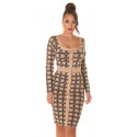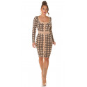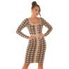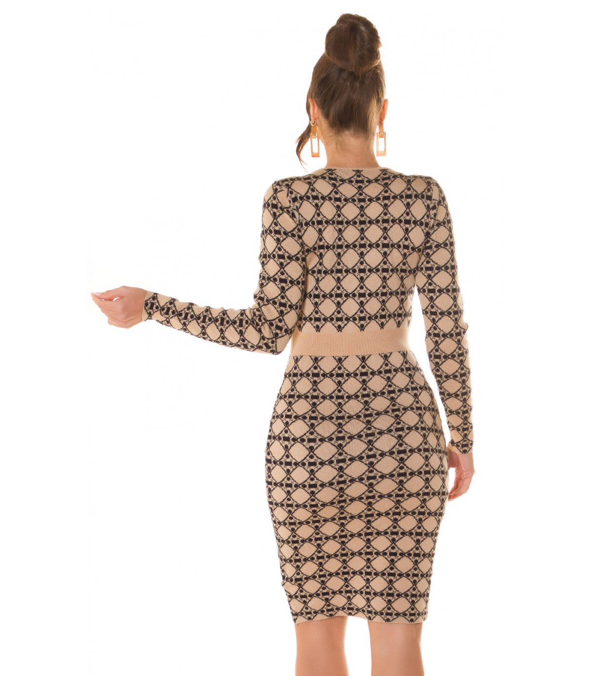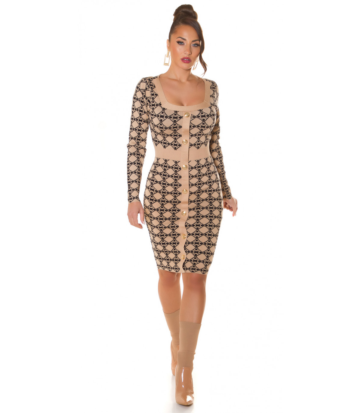 Cappuccino long-sleeved print pattern knitted dress with buttons. A stylish knitted dress is suitable for many different occasions. A beautiful knitted dress with button trim is an elegant choice of clothing for dates, casual wear and evening gatherings, among other things. A long-sleeved knitted dress is suitable for many workplaces and occasions that require representation. The print pattern and buttons are delightful details. A midi-length knitted dress that conforms to the figure brings out feminine shapes in a stylish way. A cappuccino black knitted dress with spectacular details will be a multifunctional and stylish addition to the wardrobe. With this knitted dress you will avoid many clothing crises! An elastic knitted dress is comfortable to wear.