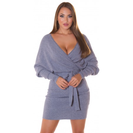 Gray wrap-look v-knit dress with bat sleeves and belt