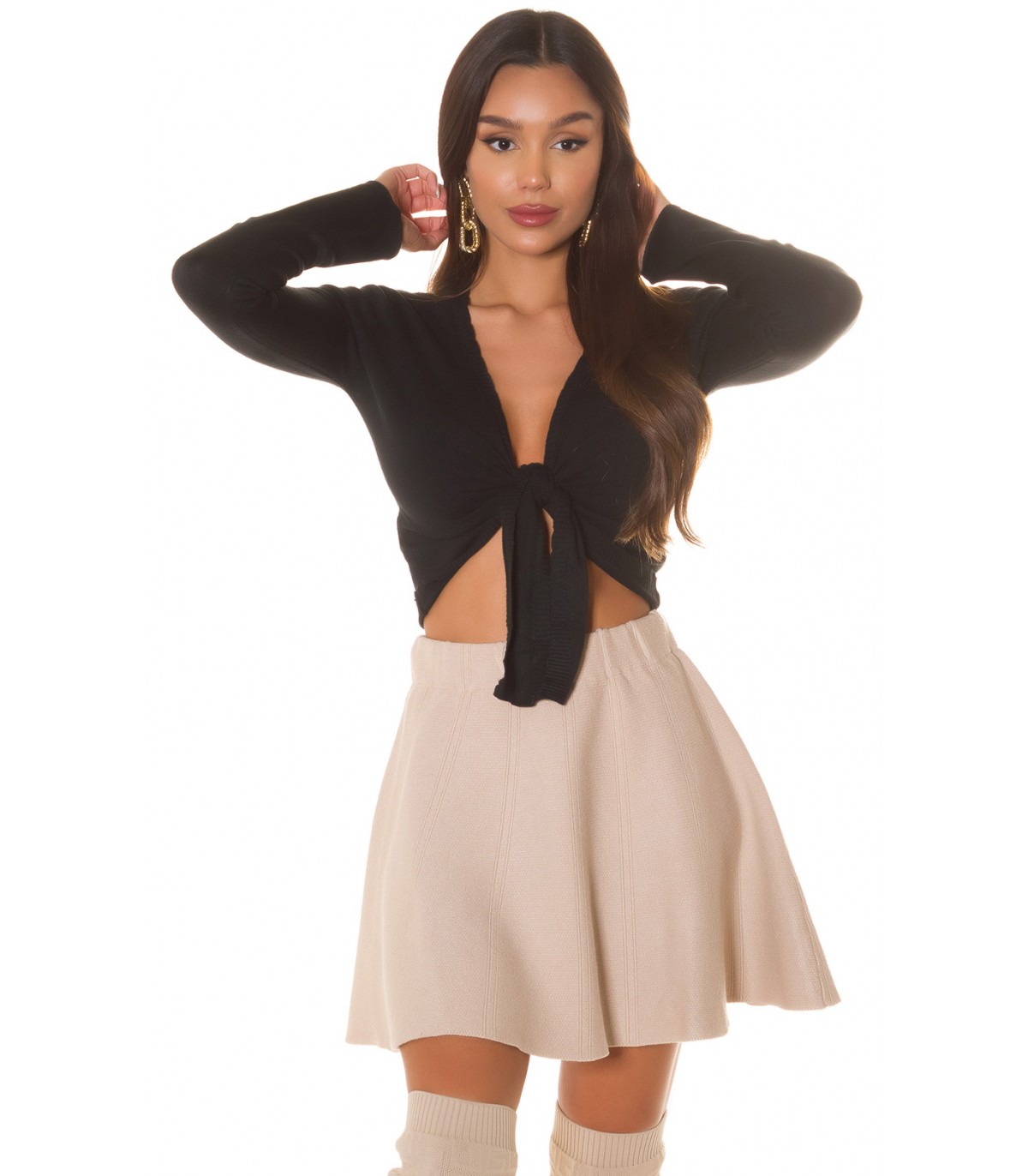 Black long-sleeved tieable short knitwear. Tip: Try tying the knitwear also in wrap style crossed behind your back.