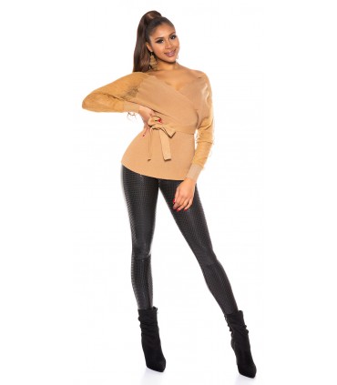Koucla cappuccino lace sleeve wrap-look v-knit with belt