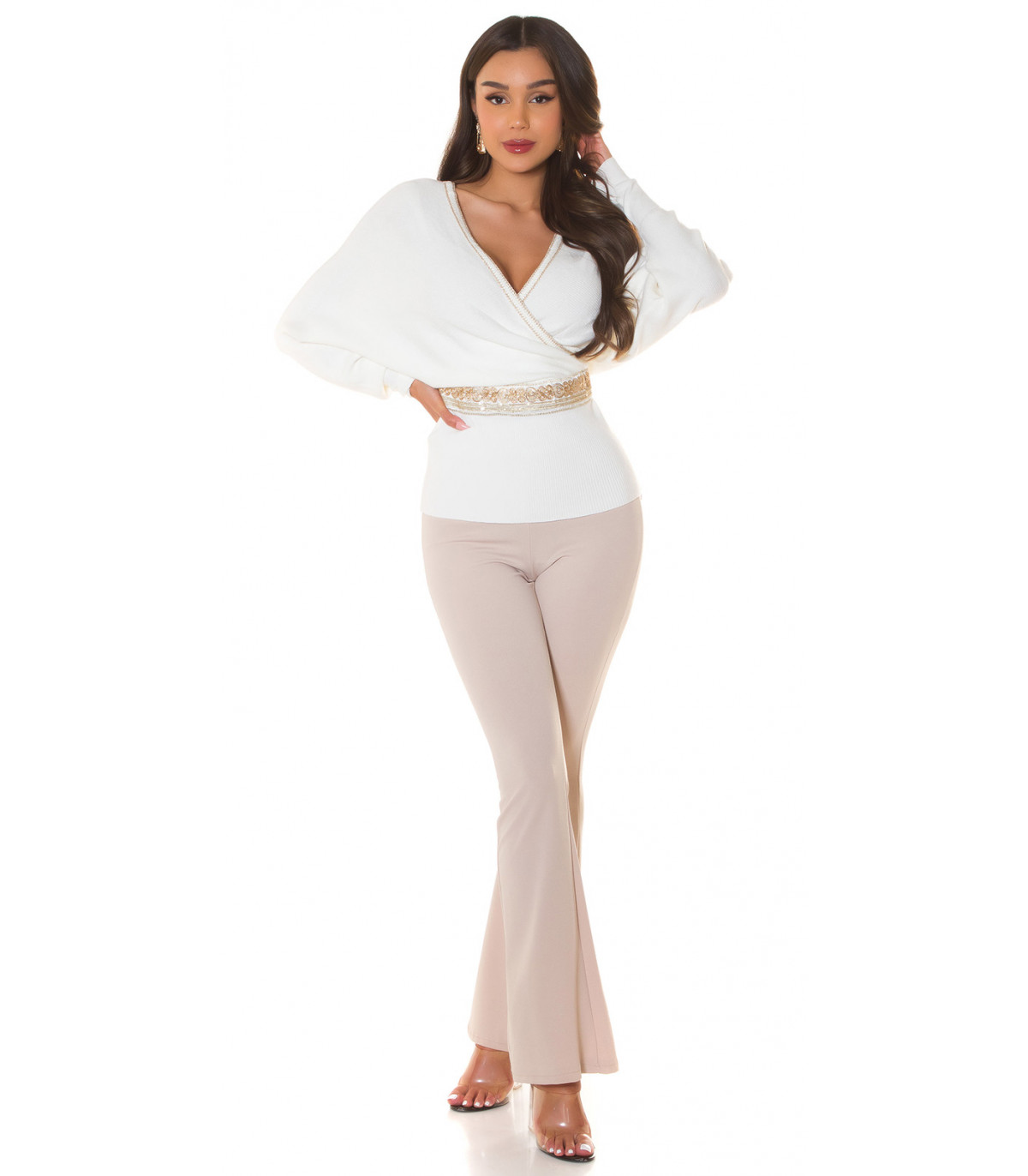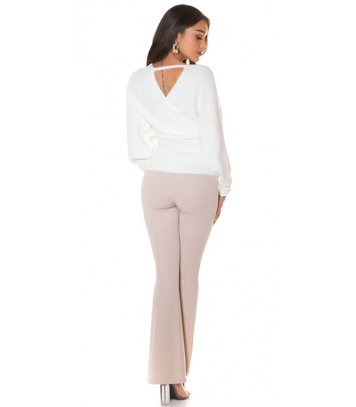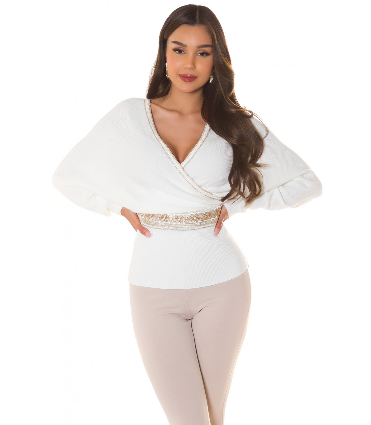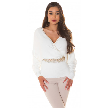 White Decorative Bat Sleeve Wrap Look V-Knit