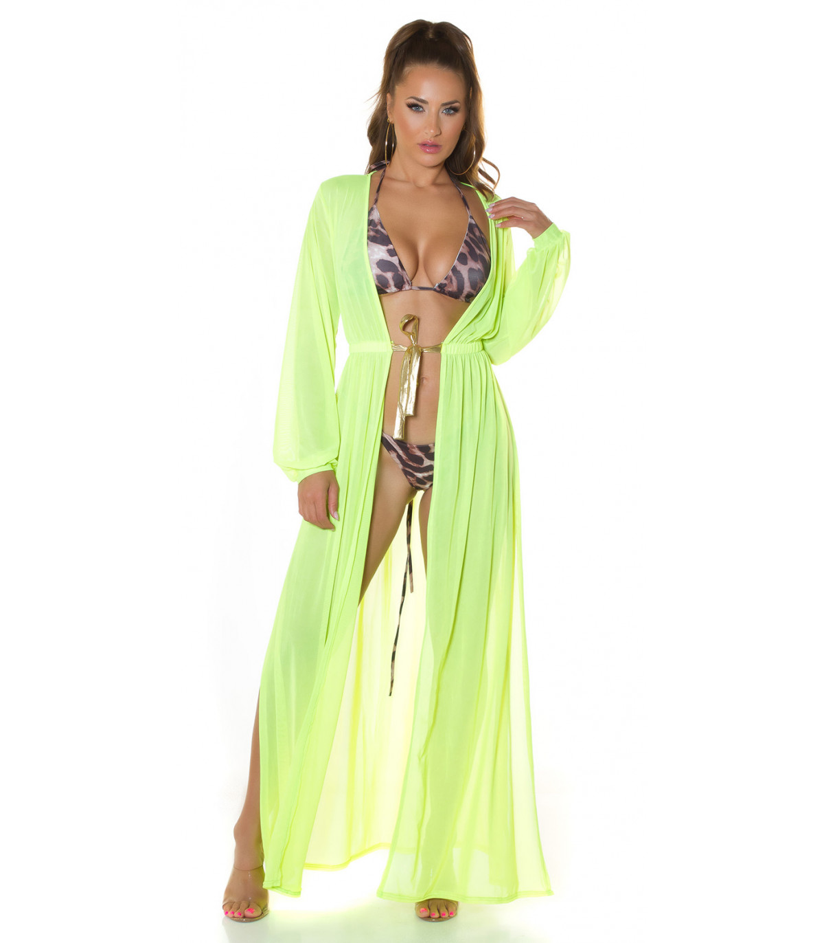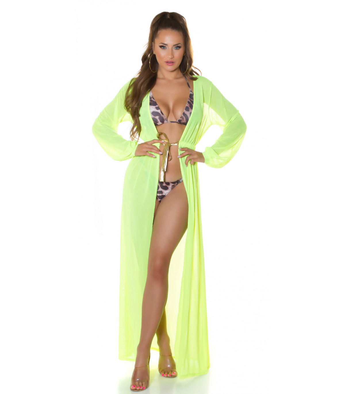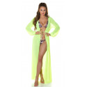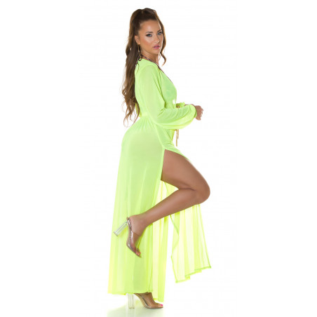Koucla neon yellow long mesh kimono with gold ribbons