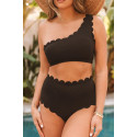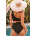 Black one-shoulder wavy bikini and matching high-waisted bikini pants. If you're wondering between two sizes, take the smaller size; However, please note that the model is best suited for people with fairly small breasts.