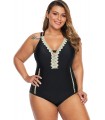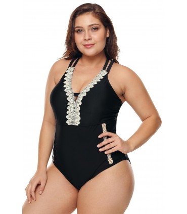 Black decorative embroidered swimsuit with light tops. There are no curves in the swimsuit. The swimsuit is flexible material. The model is also suitable for bigger breasts and best for about 165 centimeters.