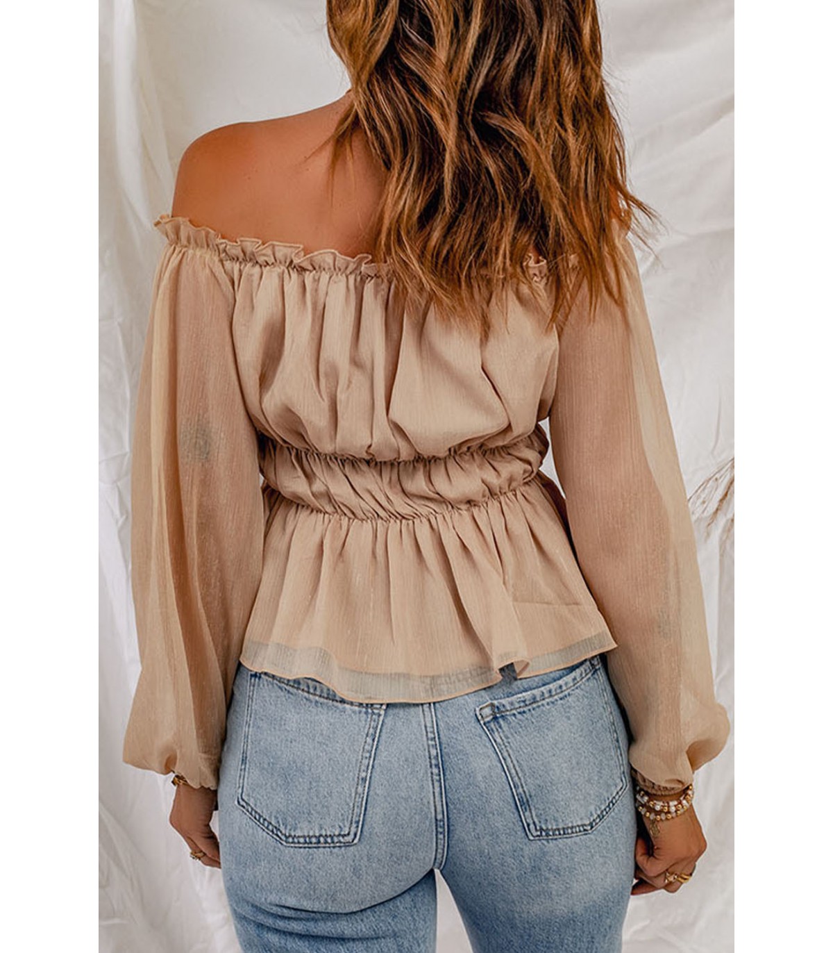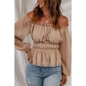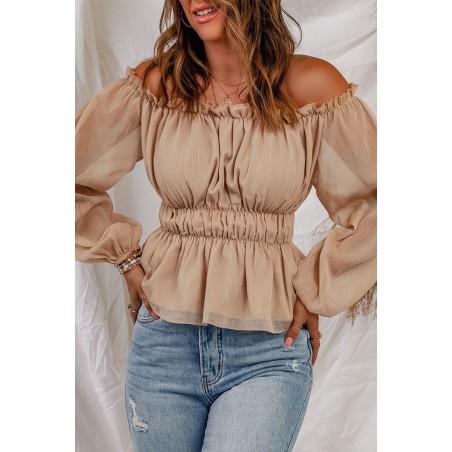 Apricot long-sleeved shoulder revealing baggy sleeve blouse. Elastic elastic bands at the waist.