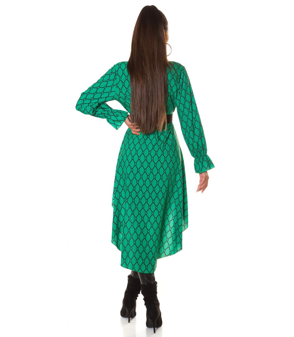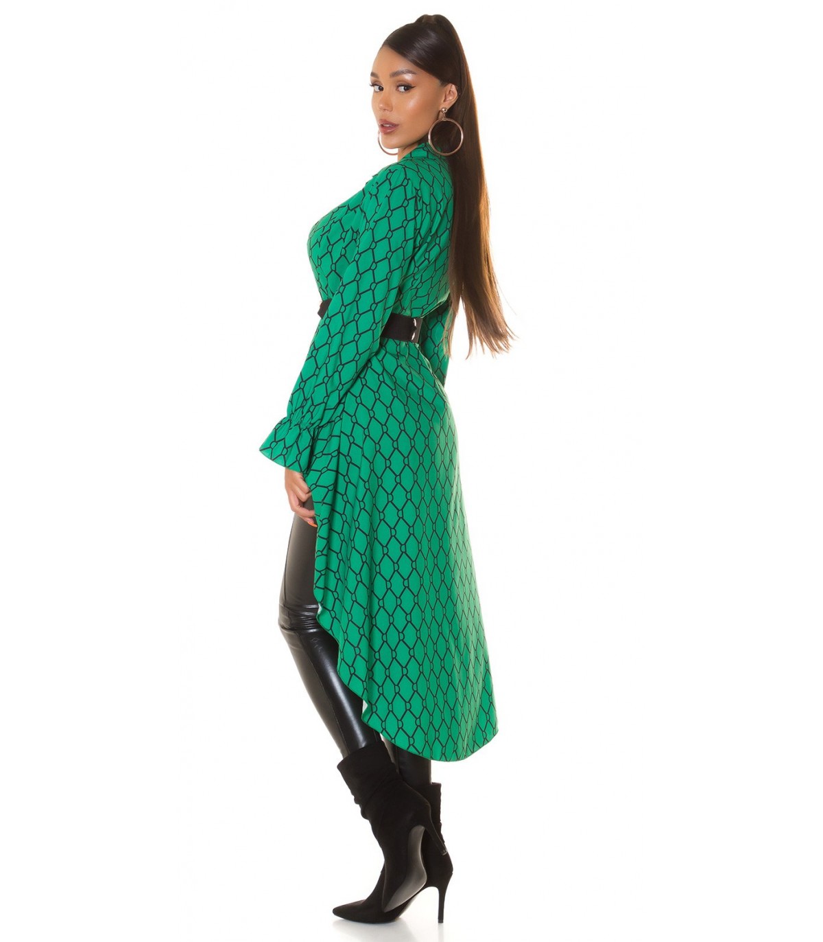 Plus de details Last items in stockGreen-and-black print pattern high low blouse with belt [DISCOVERY]