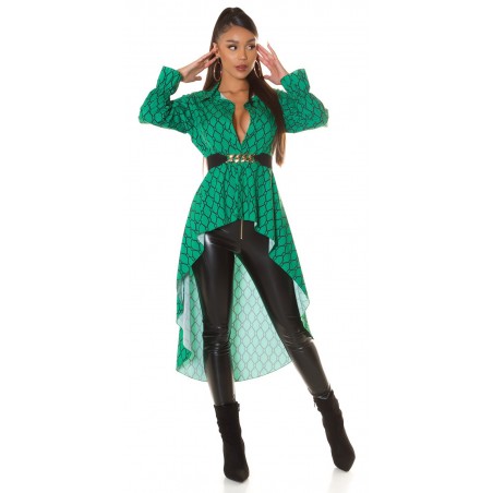 Green-and-black print pattern high low blouse with belt [DISCOVERY]