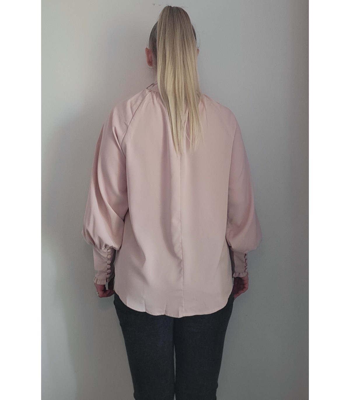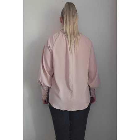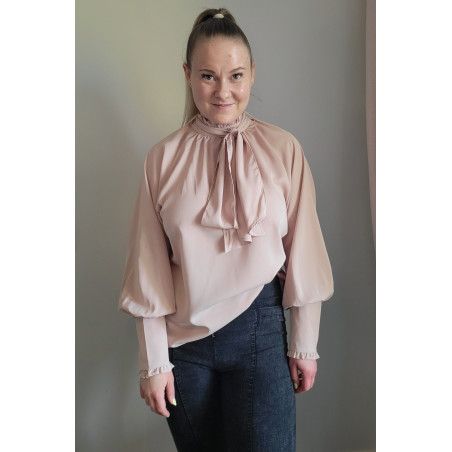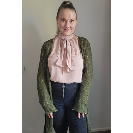 Khaki long-sleeved loose-fitting blouse with baggy sleeves and knotted bow ties. A bow tie tied to the collar of a blouse is a fabulous detail that garners praise. The blouse also has lovely bag sleeves and the cuffs are decorated with stylish buttons.