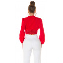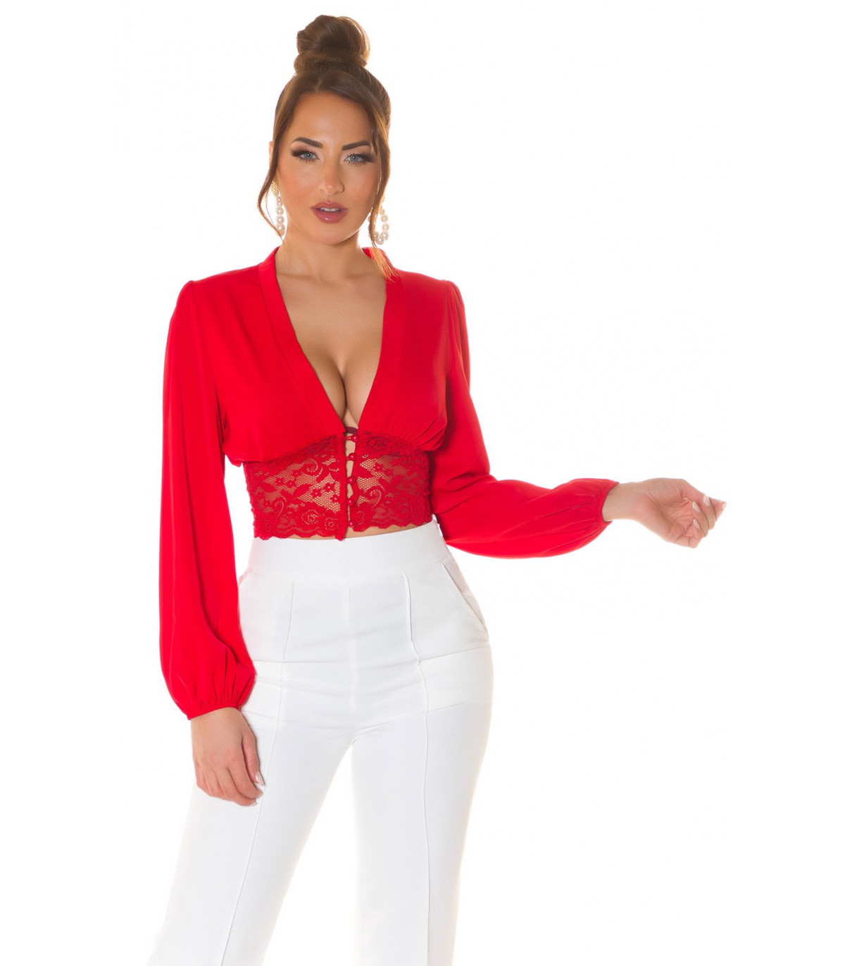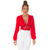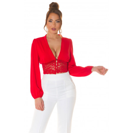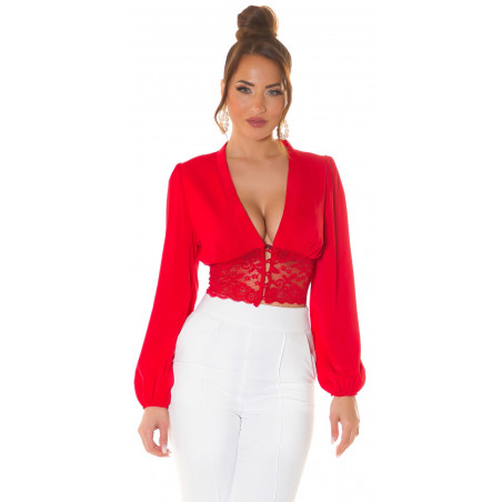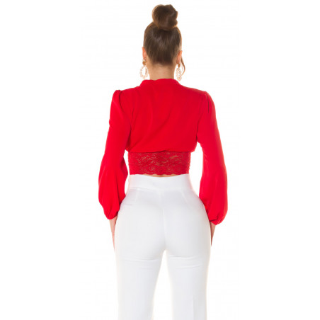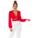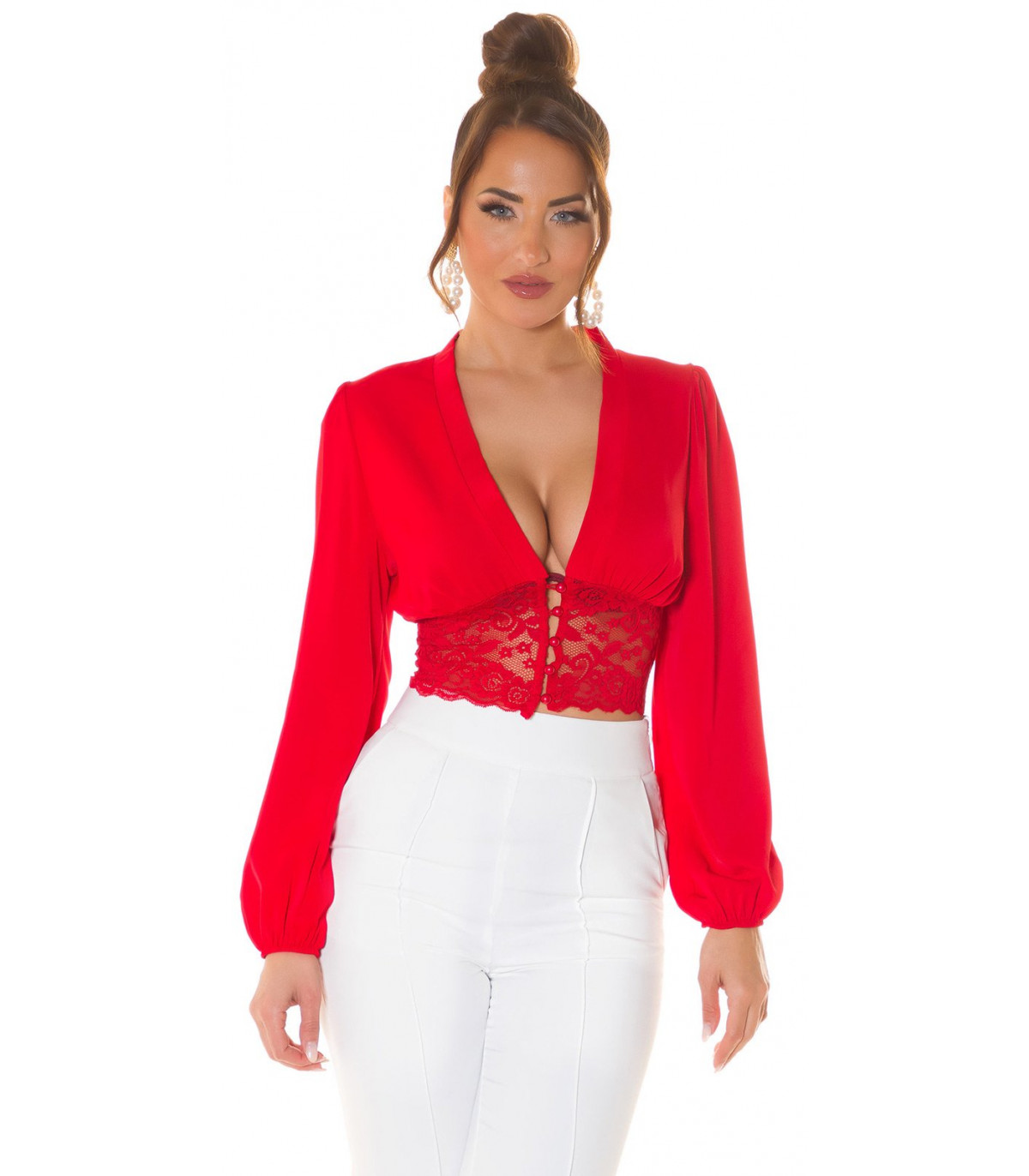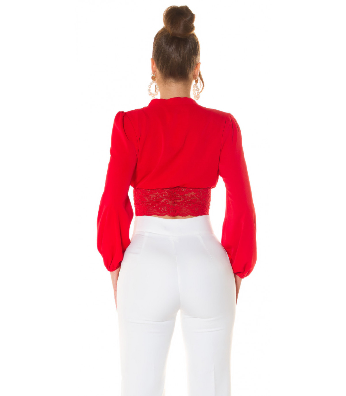 Koucla red baggy sleeved short v-blouse with lace and beads