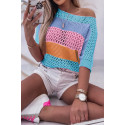 Colorful striped half-sleeved translucent crochet shirt.