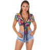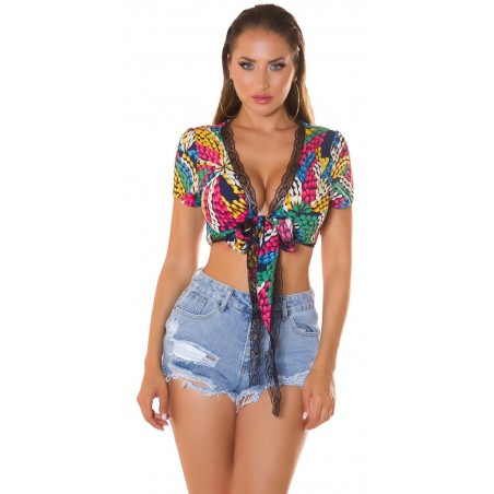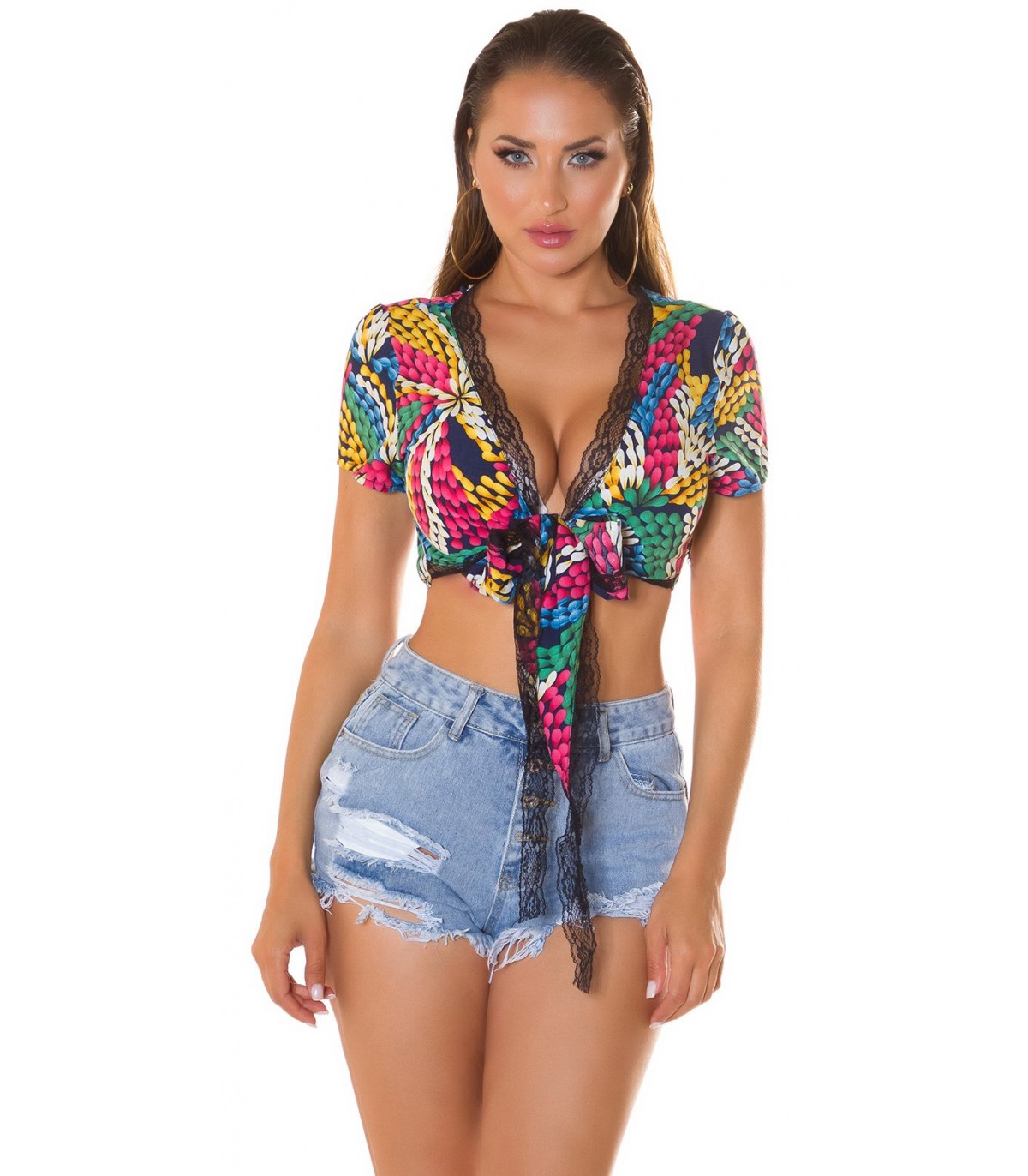 Dark blue color print short short v-shirt with lace. The shirt can be knotted at the front or, in a wrapping style, crossed behind the back.