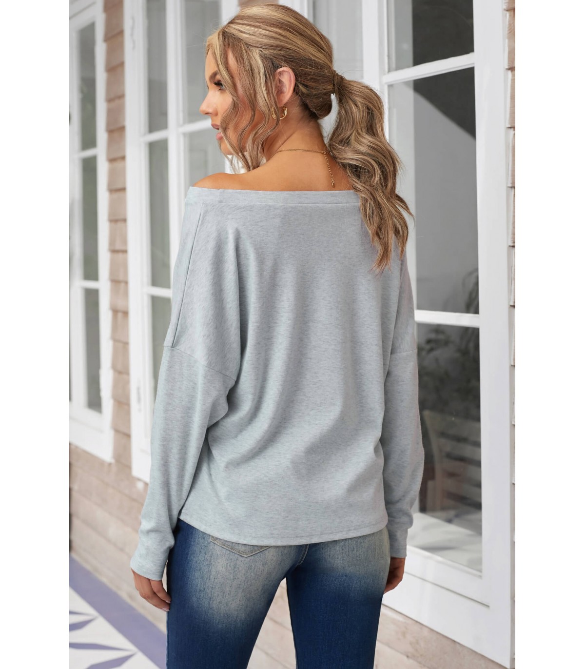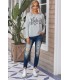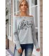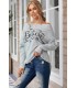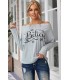 Grey shoulder-revealing long-sleeved loose shirt with Believe text and snowflakes.