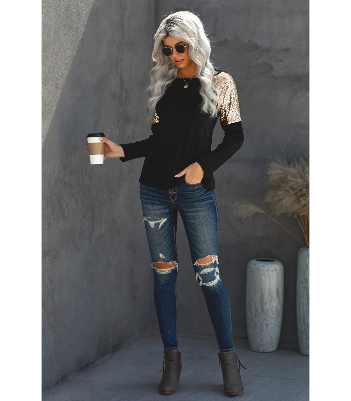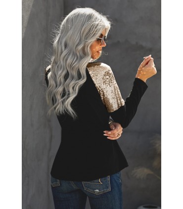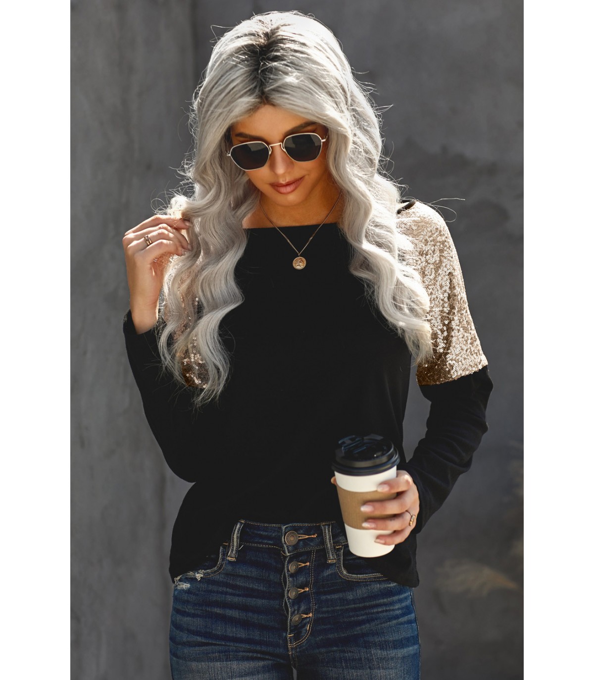 Black long-sleeved sequined loose-fitting shirt. A black shirt with sequined ornaments is suitable for many different styles. Sparkling sequins add an extra touch to an otherwise simple shirt. A long-sleeved T-shirt with sequins is suitable for both everyday wear and various evenings.