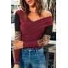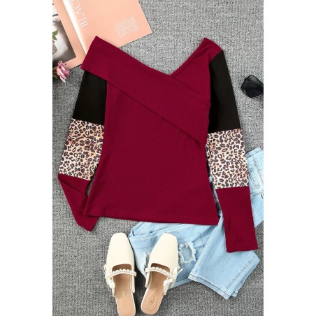 Red long-sleeved wrap look leo-decorated ribbed shirt