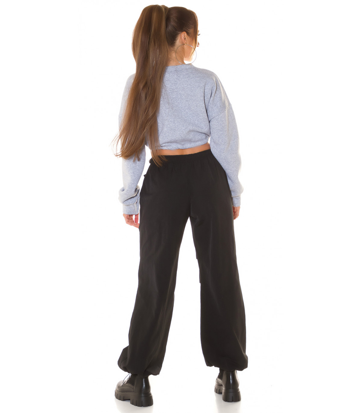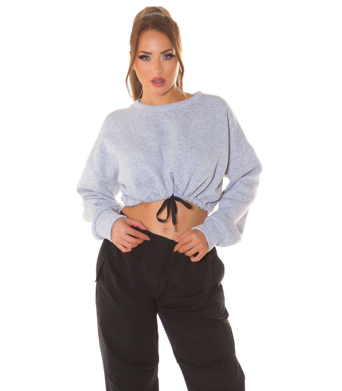 A short shirt is a trendy casual garment that is both casual and sporty at the same time. The sporty style has established its place in casual wear, and people wear sporty clothes even without the intention of going to training. The sporty look is trendy and fresh. The oversized sweatshirt is opaque, but the short model that reveals the waist brings out the body, bringing sportiness to the outfit. With tightening straps, you can tighten the hem just right for you. A cropped shirt looks especially good with high-waisted tights, joggers or jeans. A gray short sweatshirt goes well with black, white and gray trousers, for example. Pants are not included.