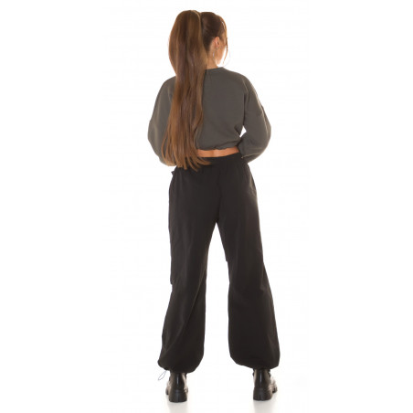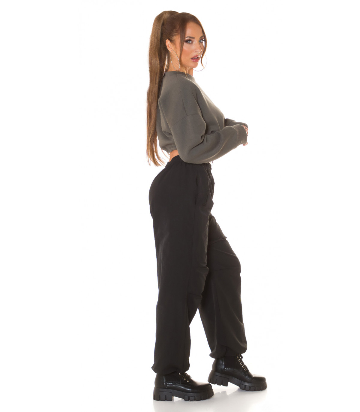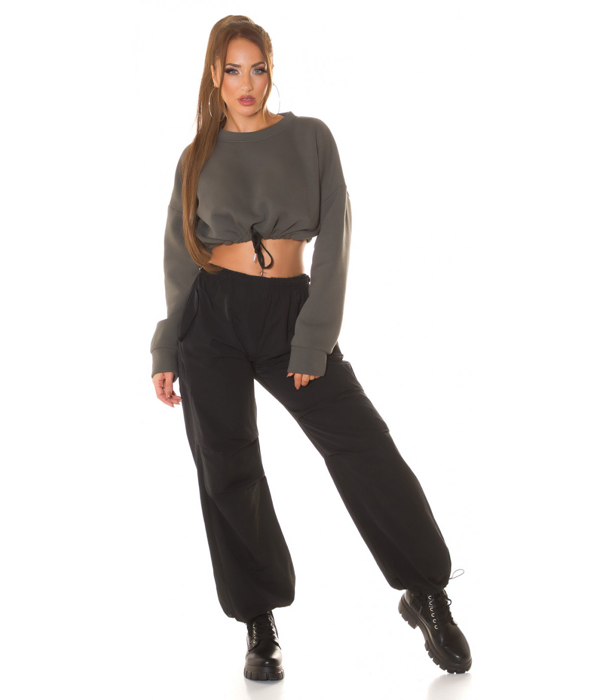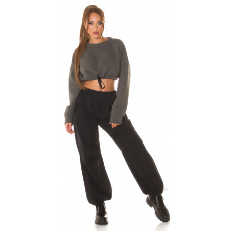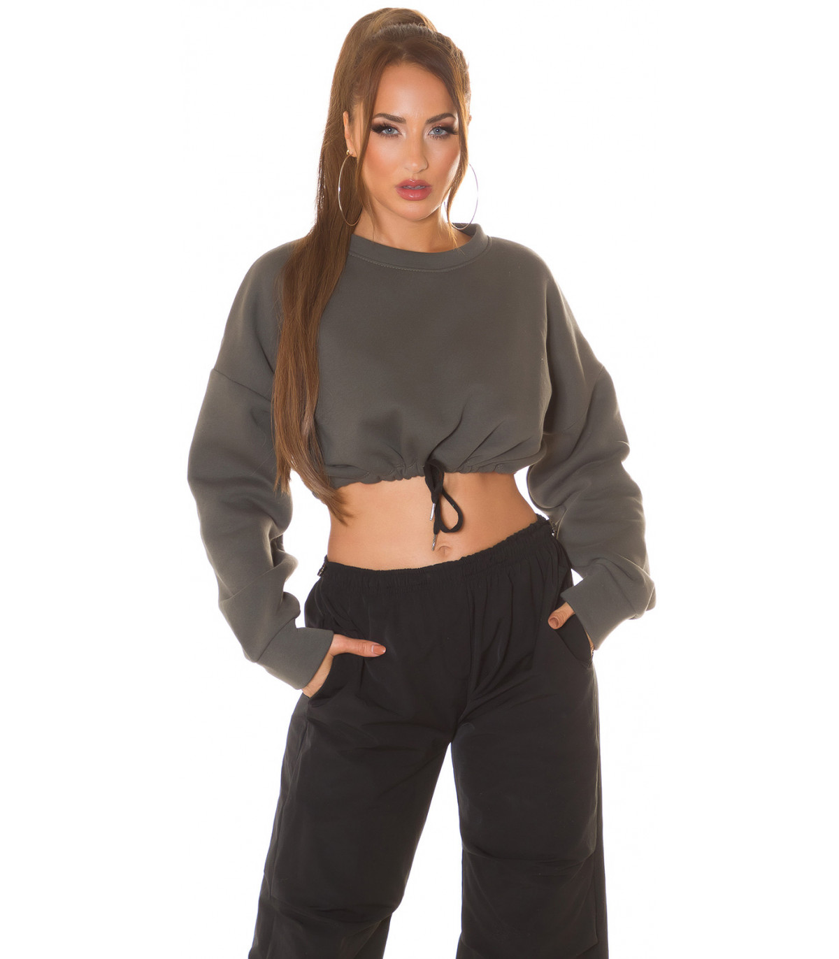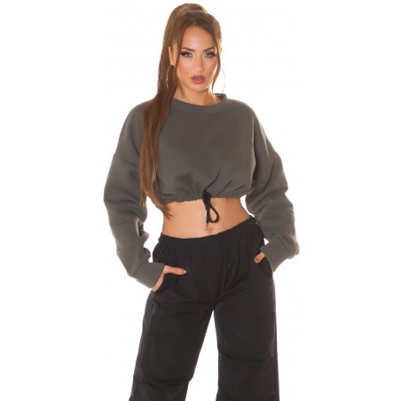 A short shirt is a trendy casual garment that is both casual and sporty at the same time. The sporty style has established its place in casual wear, and people wear sporty clothes even without the intention of going to training. The sporty look is trendy and fresh. The oversized sweatshirt is opaque, but the short model that reveals the waist brings out the body, bringing sportiness to the outfit. With tightening straps, you can tighten the hem just right for you. A cropped shirt looks especially good with high-waisted tights, joggers or jeans. A khaki short sweatshirt goes well with black, white and khaki trousers, for example. Pants are not included.