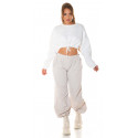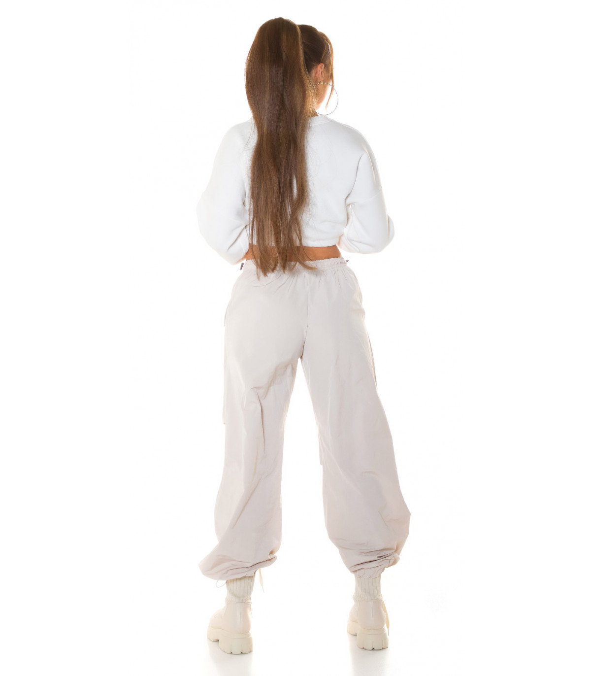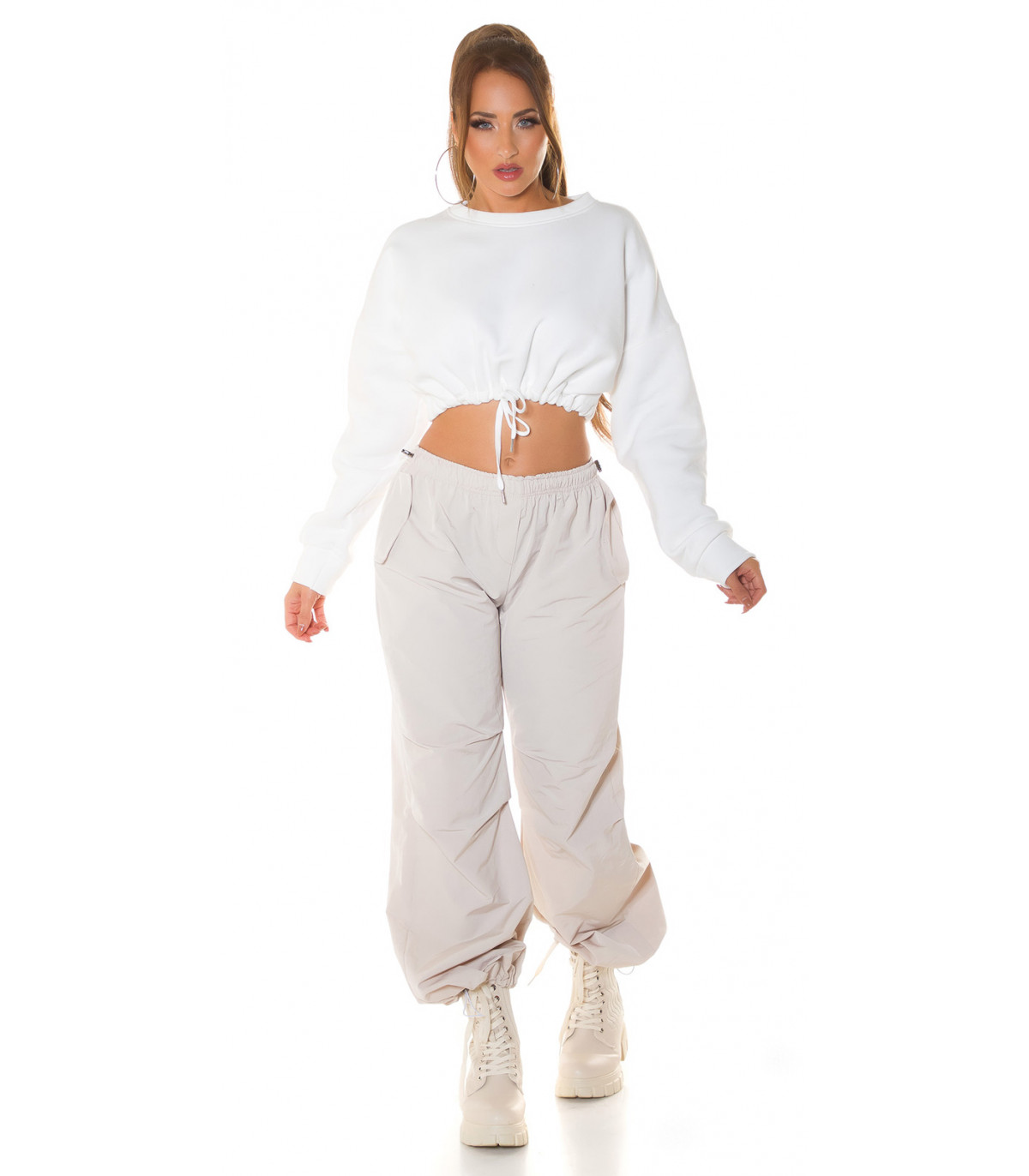 A short shirt is a trendy casual garment that is both casual and sporty at the same time. The sporty style has established its place in casual wear, and people wear sporty clothes even without the intention of going to training. The sporty look is trendy and fresh. The oversized sweatshirt is opaque, but the short model that reveals the waist brings out the body, bringing sportiness to the outfit. With tightening straps, you can tighten the hem just right for you. A cropped shirt looks especially good with high-waisted tights, joggers or jeans. A white short sweatshirt is easy to combine with bottoms of any color. Pants are not included.