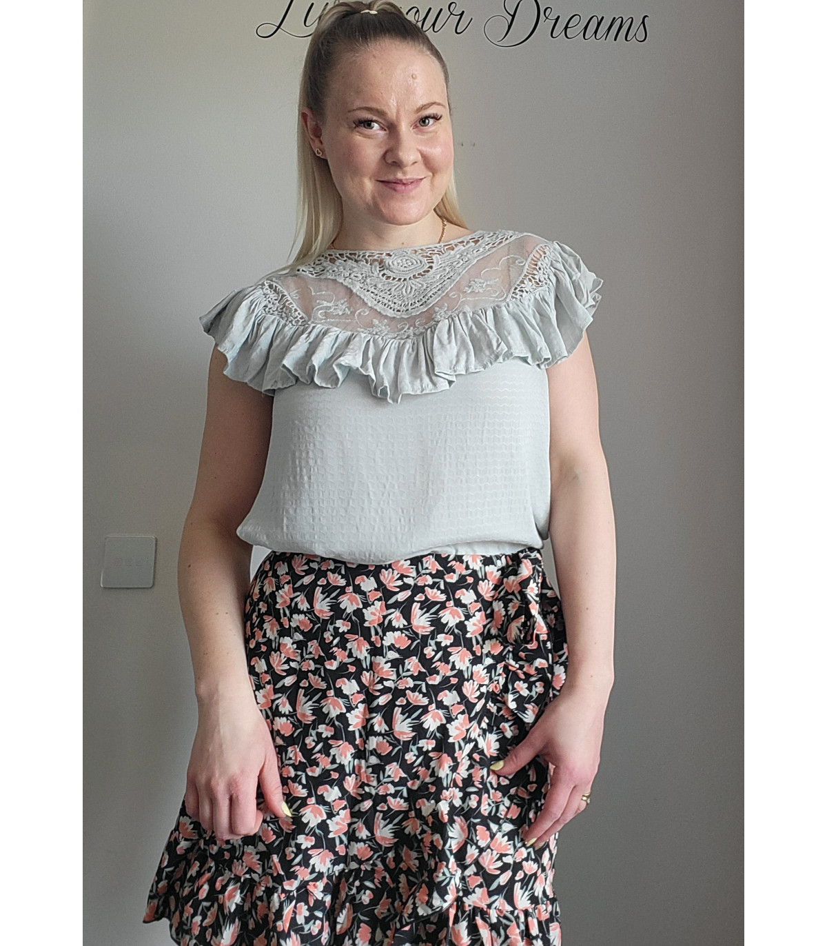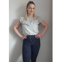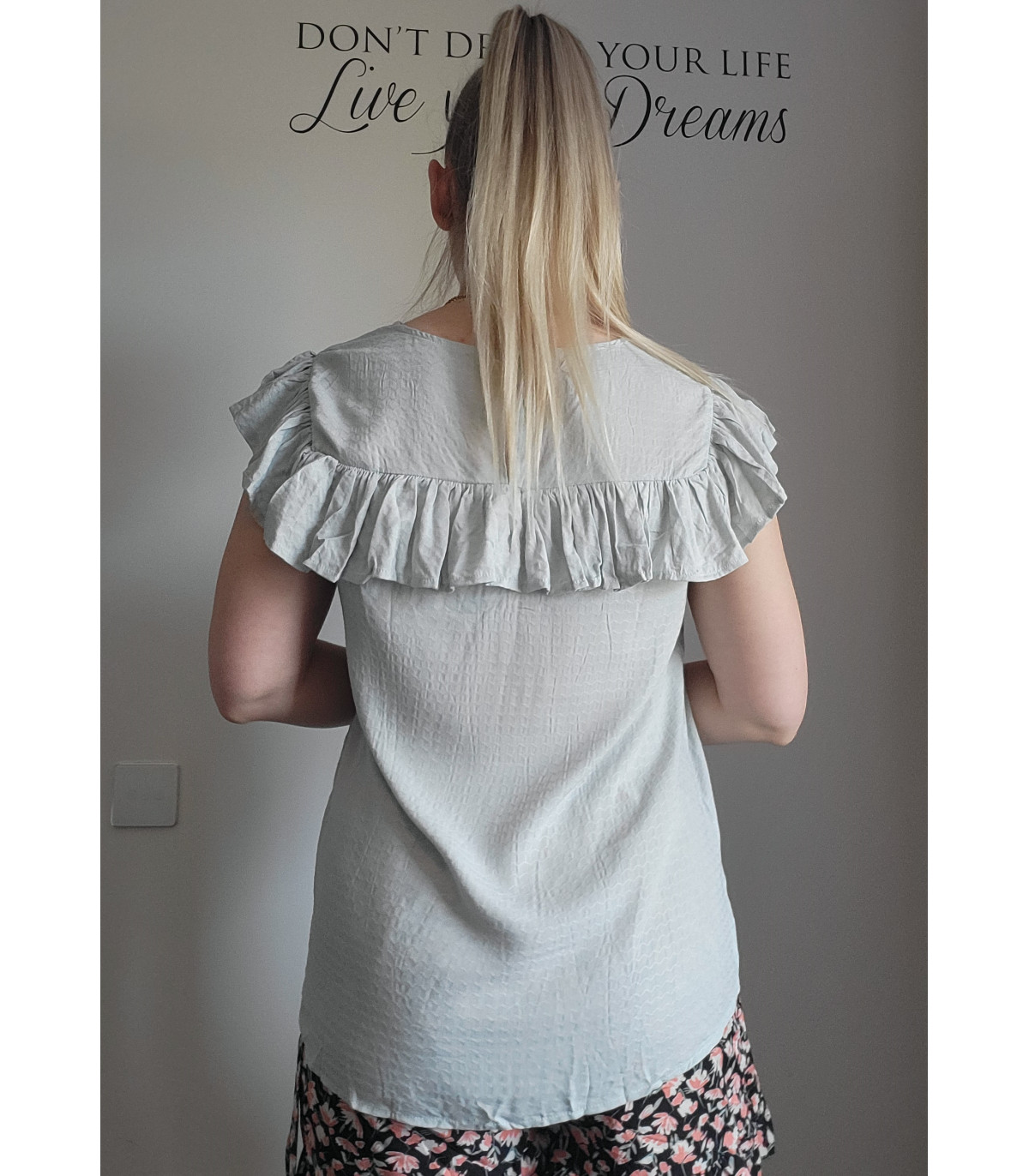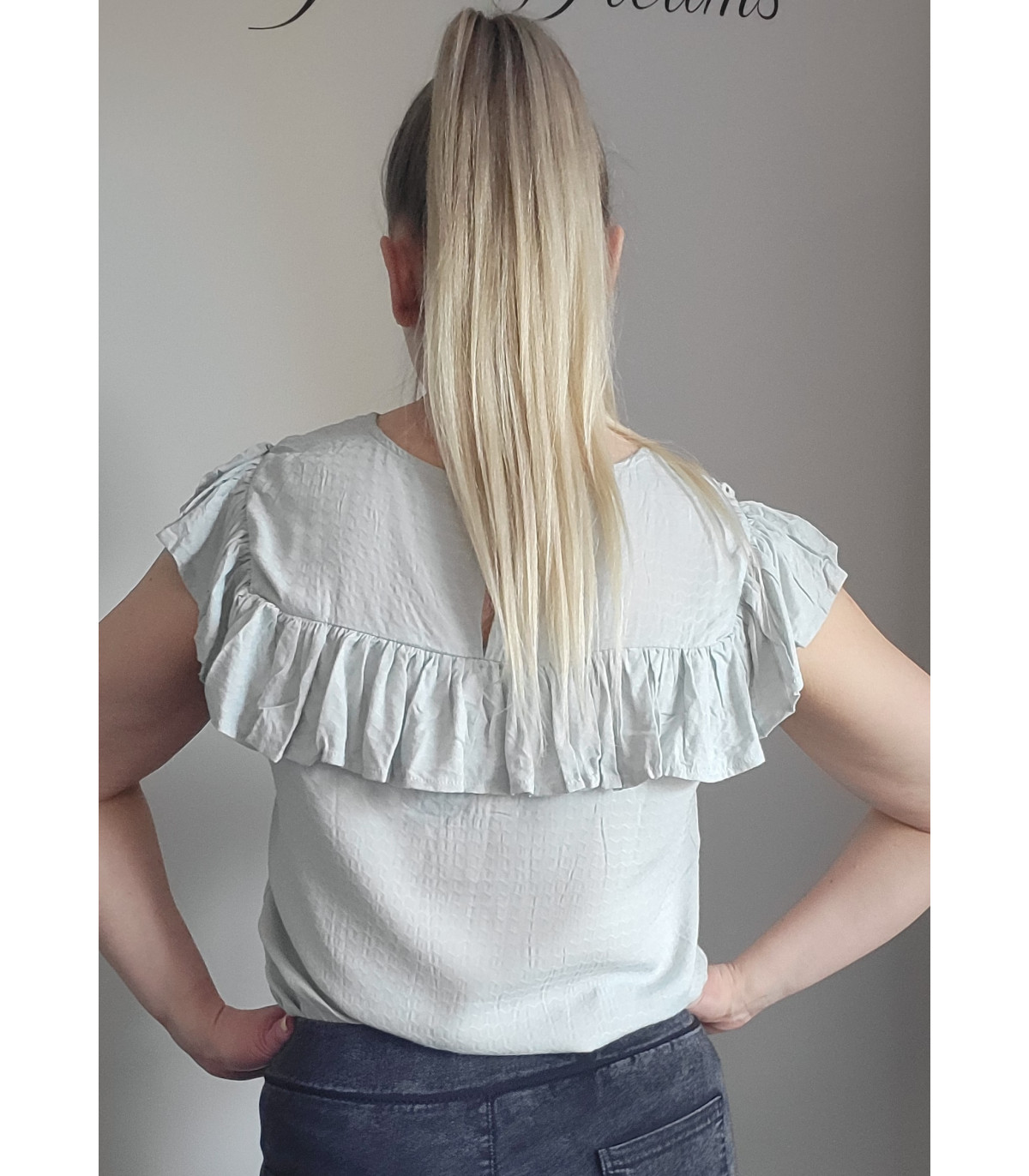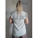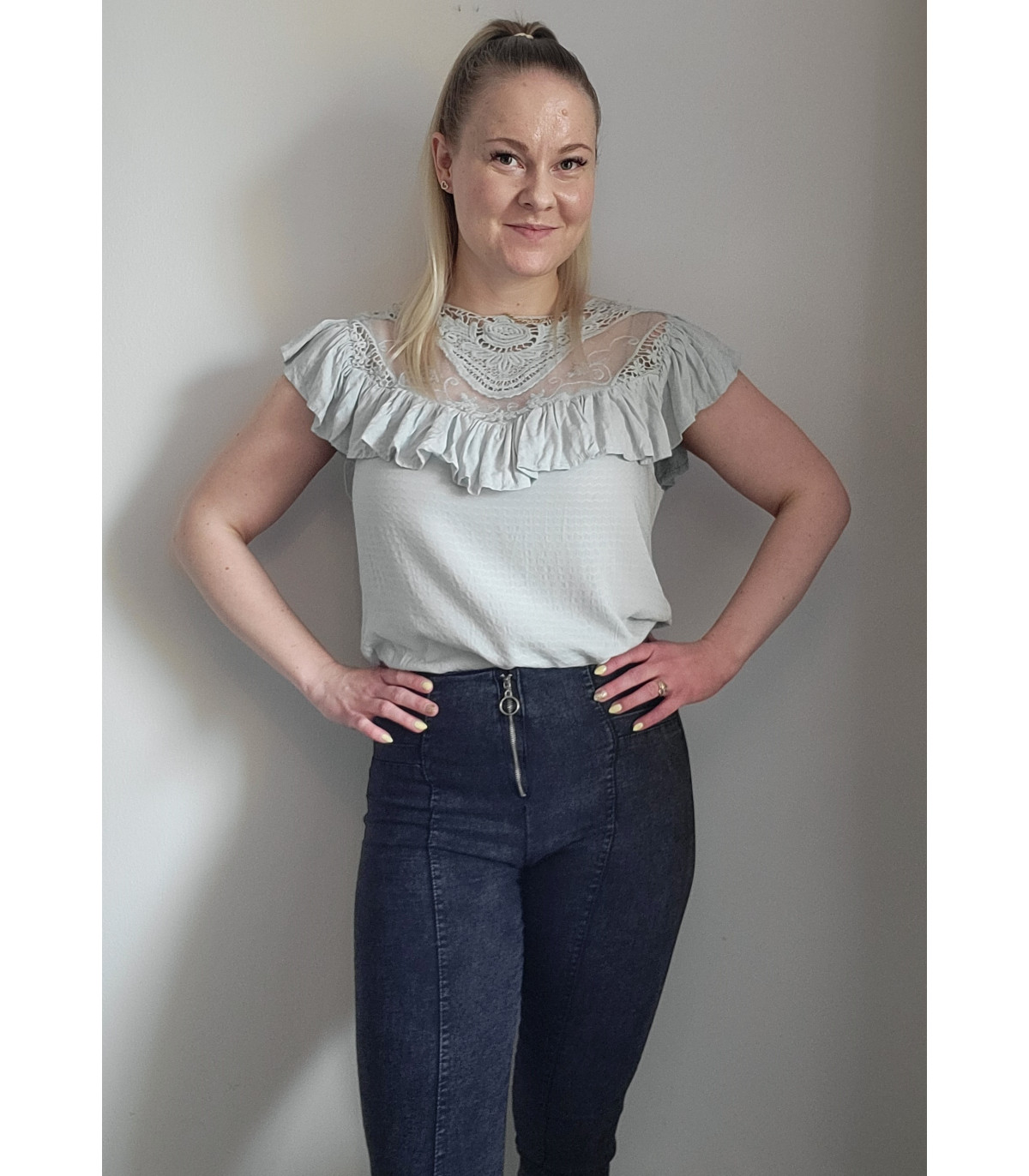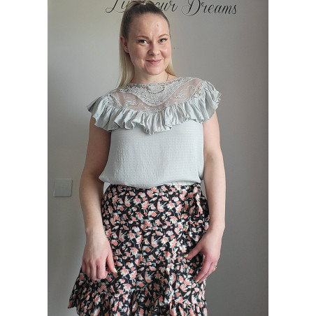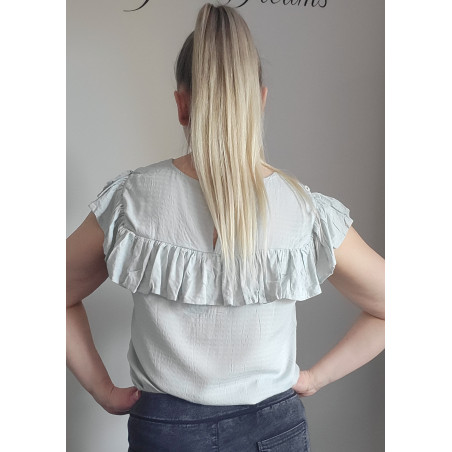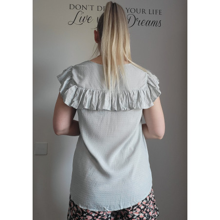 Mint green short-sleeved embroidered loose-fitting shirt with ruffle. This short-sleeved beautiful mint green shirt stands out from the crowd. A stylish ruffled shirt with gorgeous decorative embroidered lace on the chest is a beautiful shirt, for example, for a date or meeting friends and relatives. A ruffled shirt is easy to combine with both trousers and a skirt.