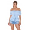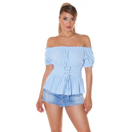 A light blue short-sleeved shoulder-baring Latin shirt with baggy sleeves and a waist-accentuating nod.