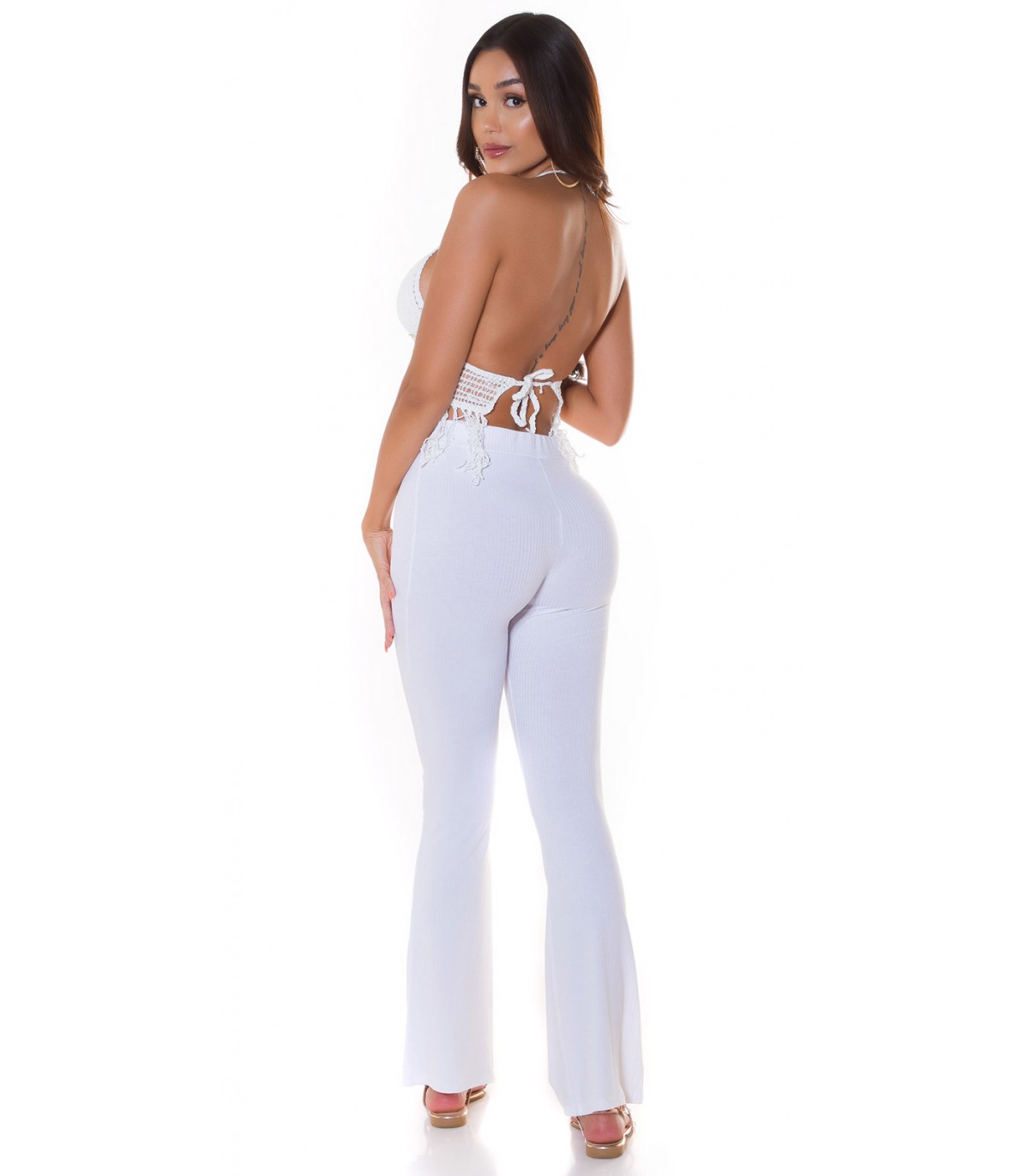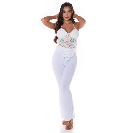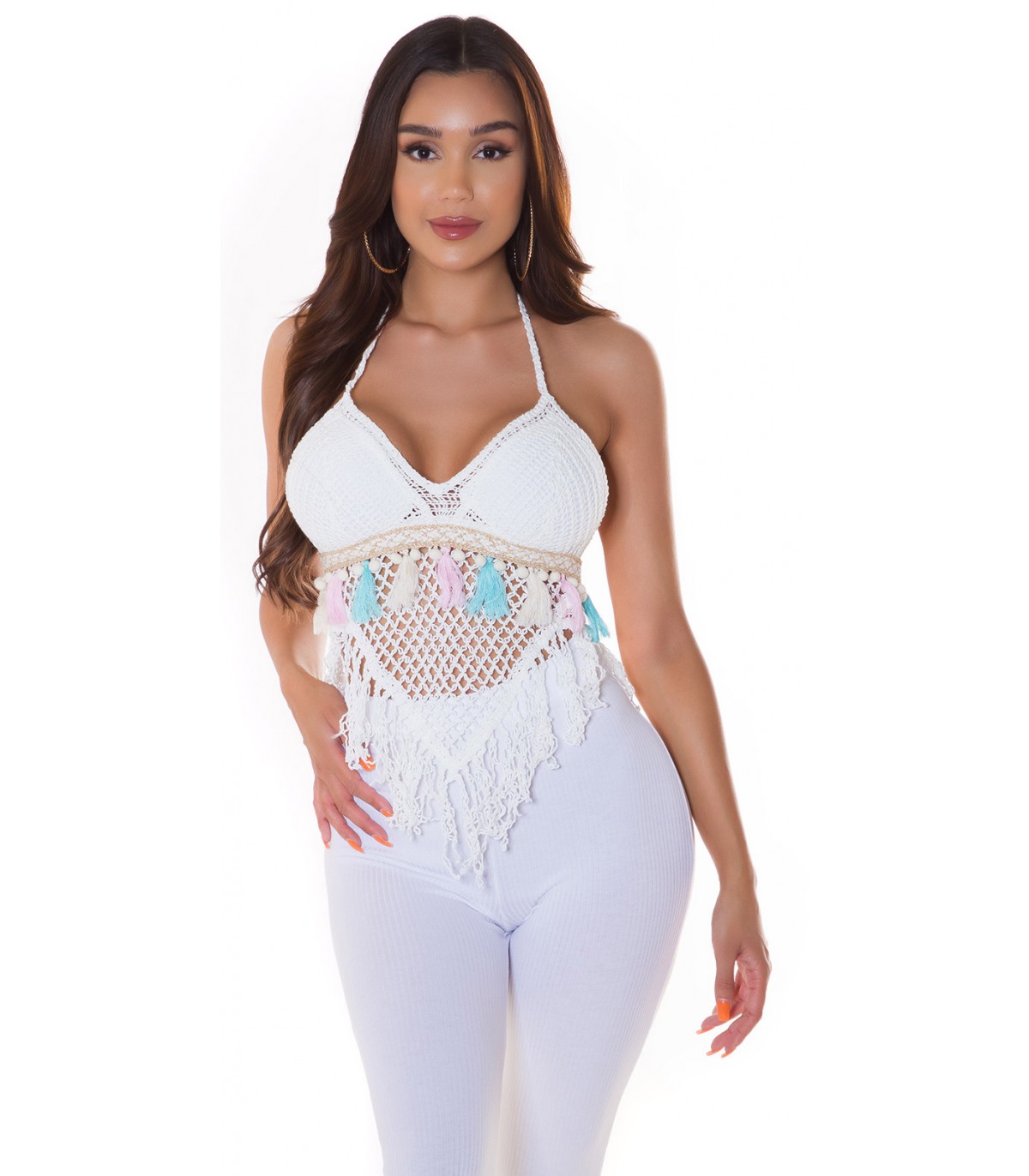 White back knotted boho-style crocheted bralette top with fringe. Best suited for about B-C cups.