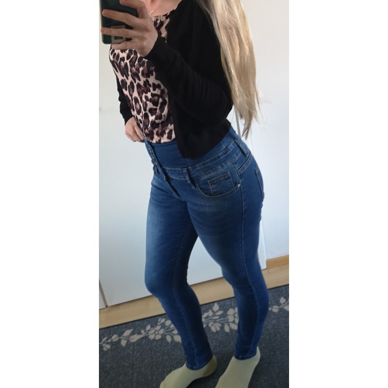 Joustavat, kauniisti istuvat farkut. Nämä korostavat vyötäröä jolloin näyttää hoikemmalta. Malli on sellaimem